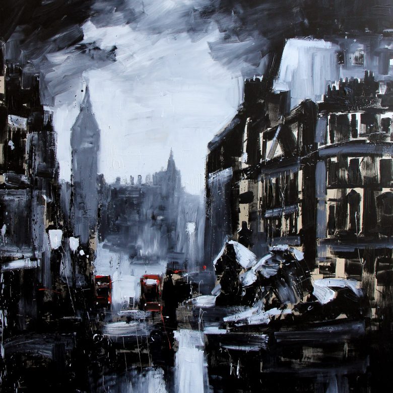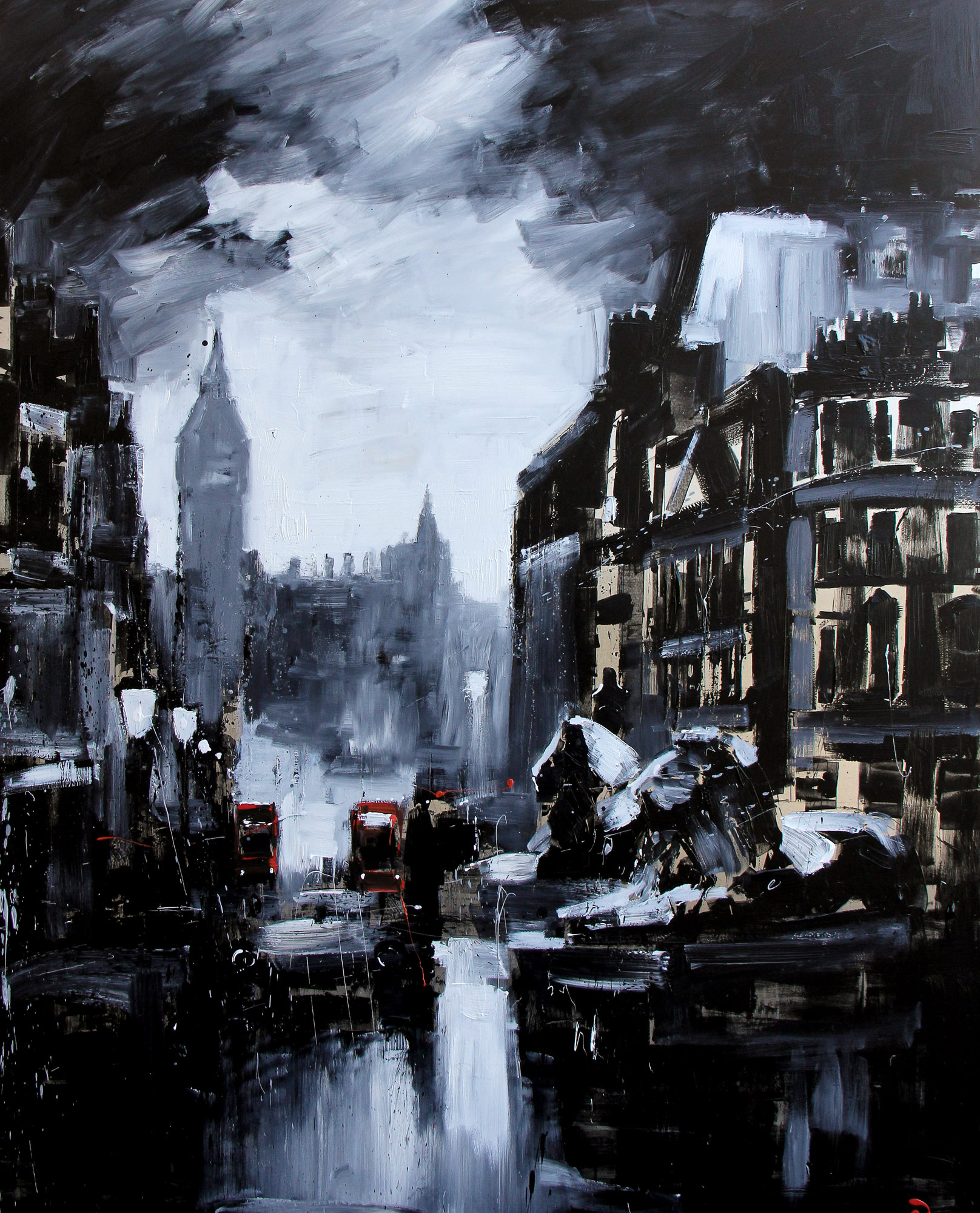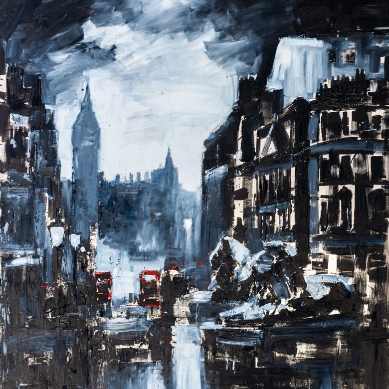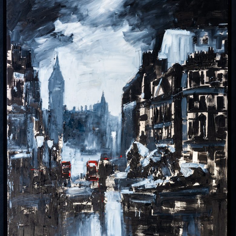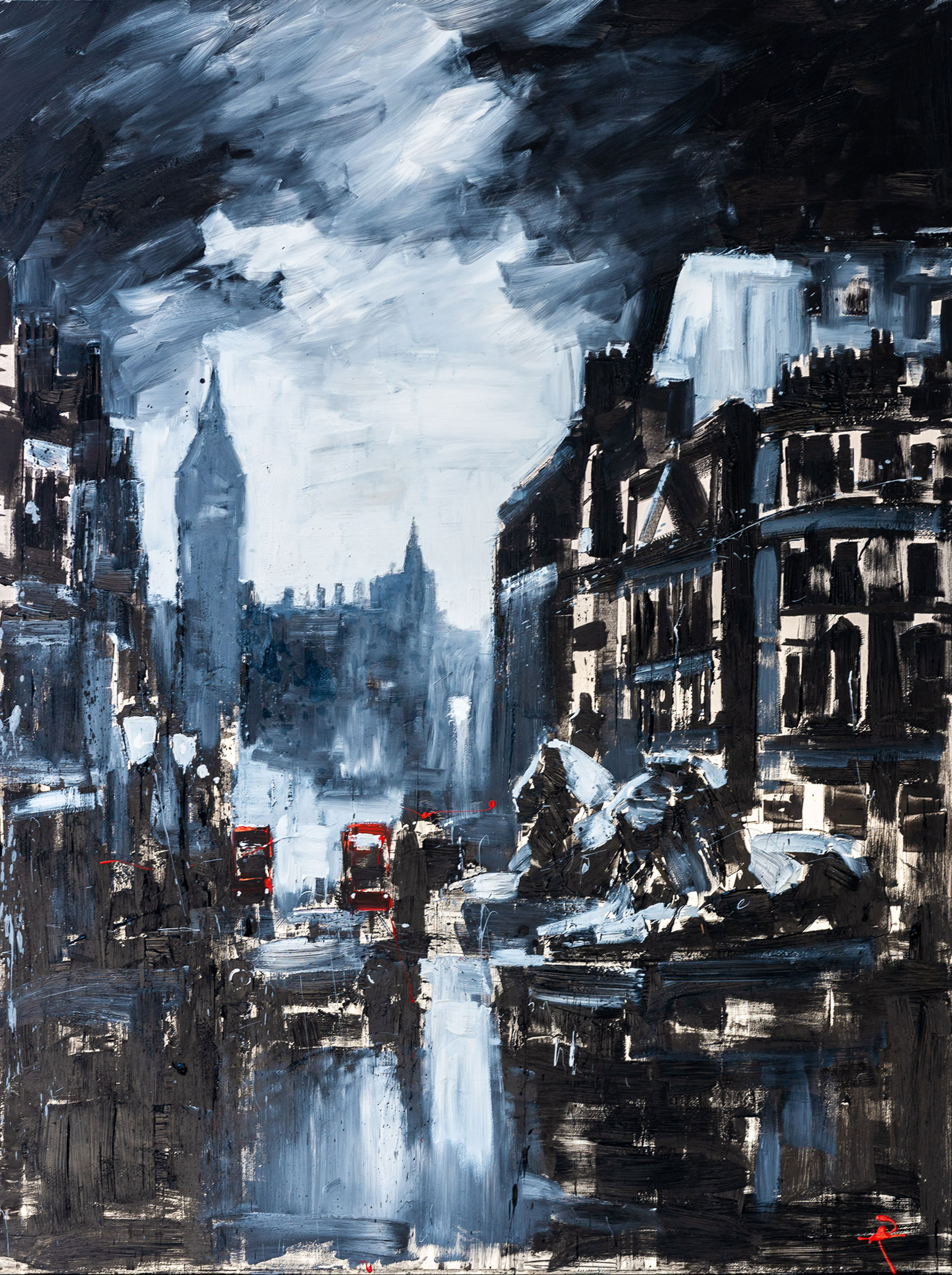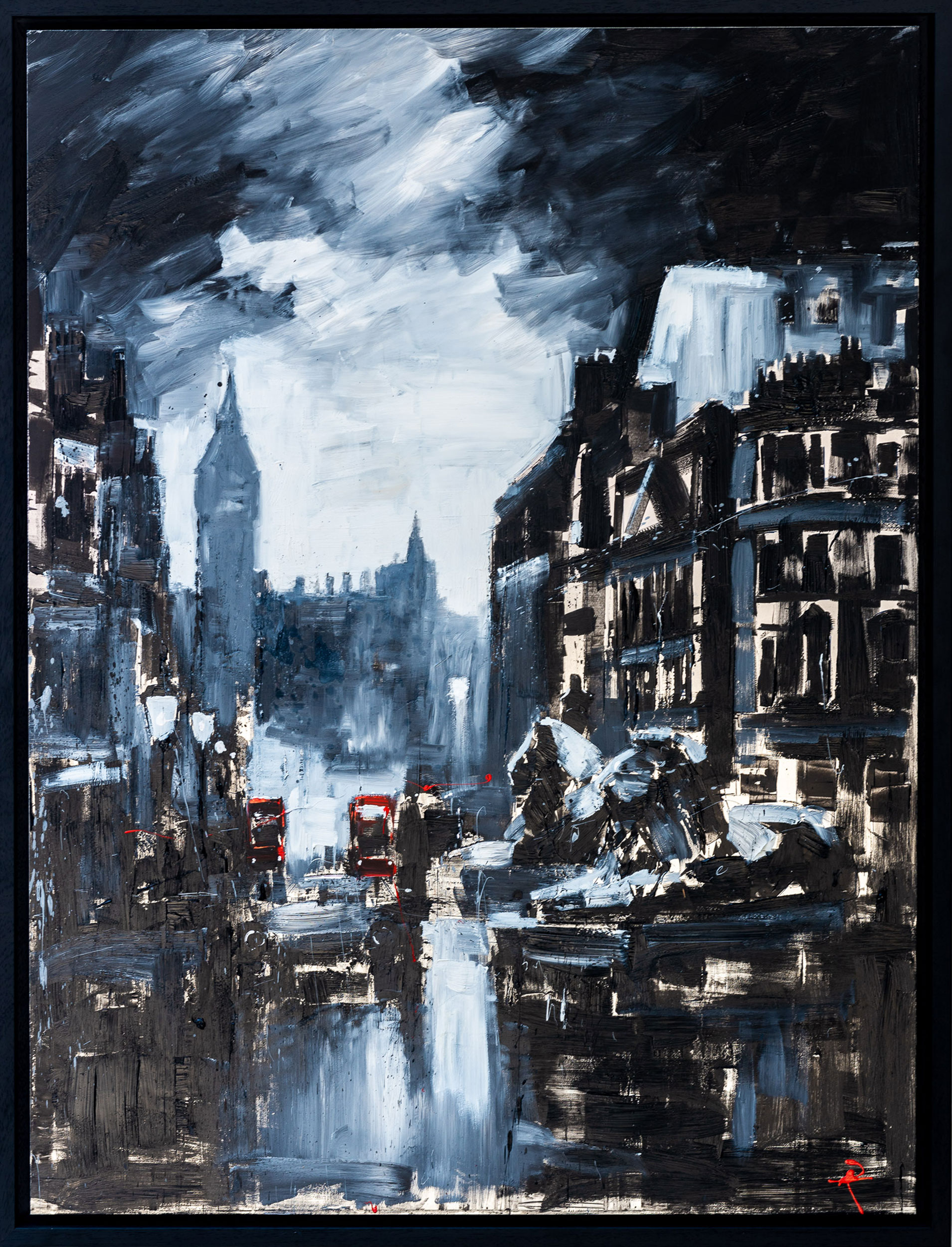 “Immerse into London” is part of Paul’s “Impressionistic Distance” series. Paul has painted with vigorous brushwork and loosly defined forms to create movement, much like impressionist painters before him. Using a monochrome palette, Paul puts emphasis on accurately capturing the light in its ever-changing qualities.
