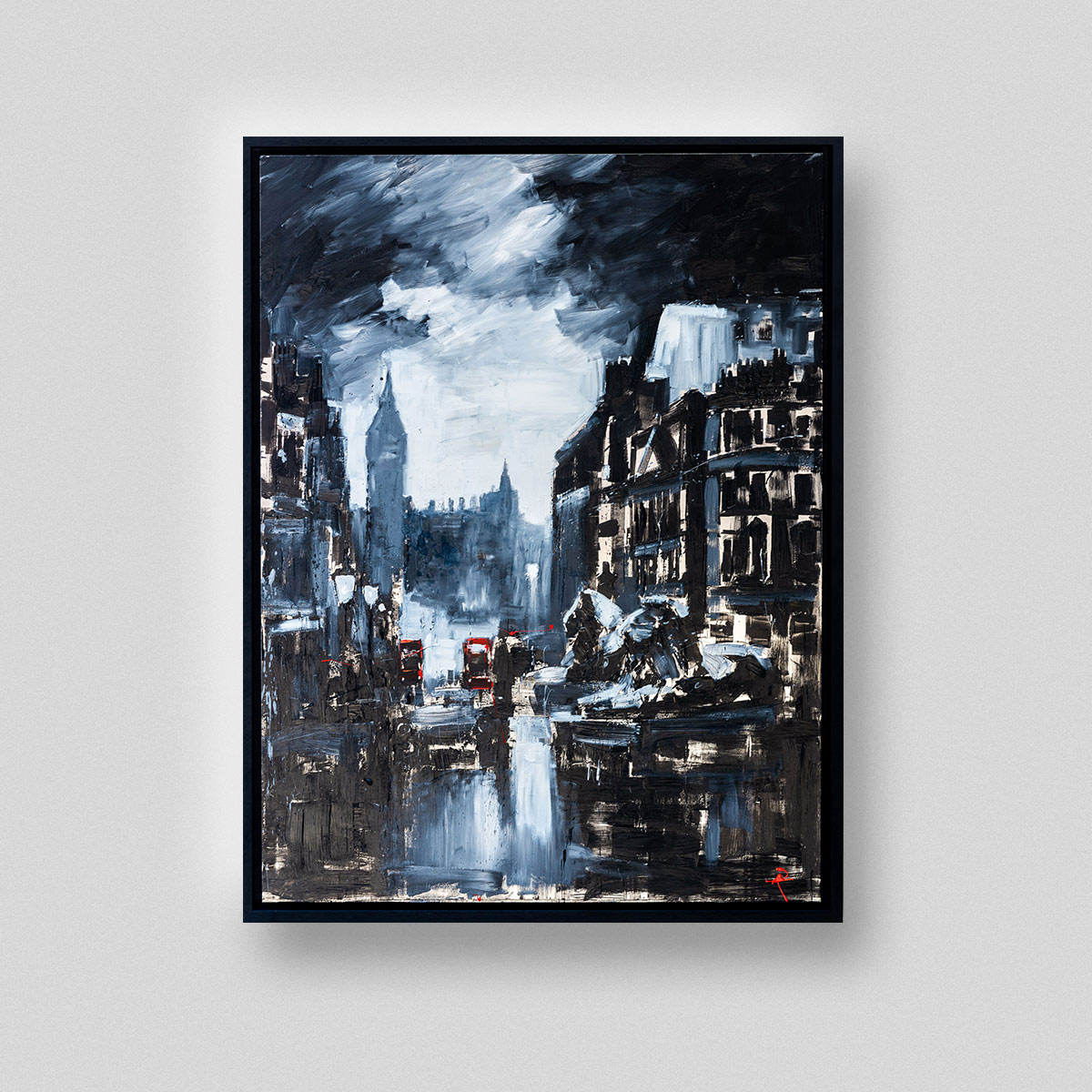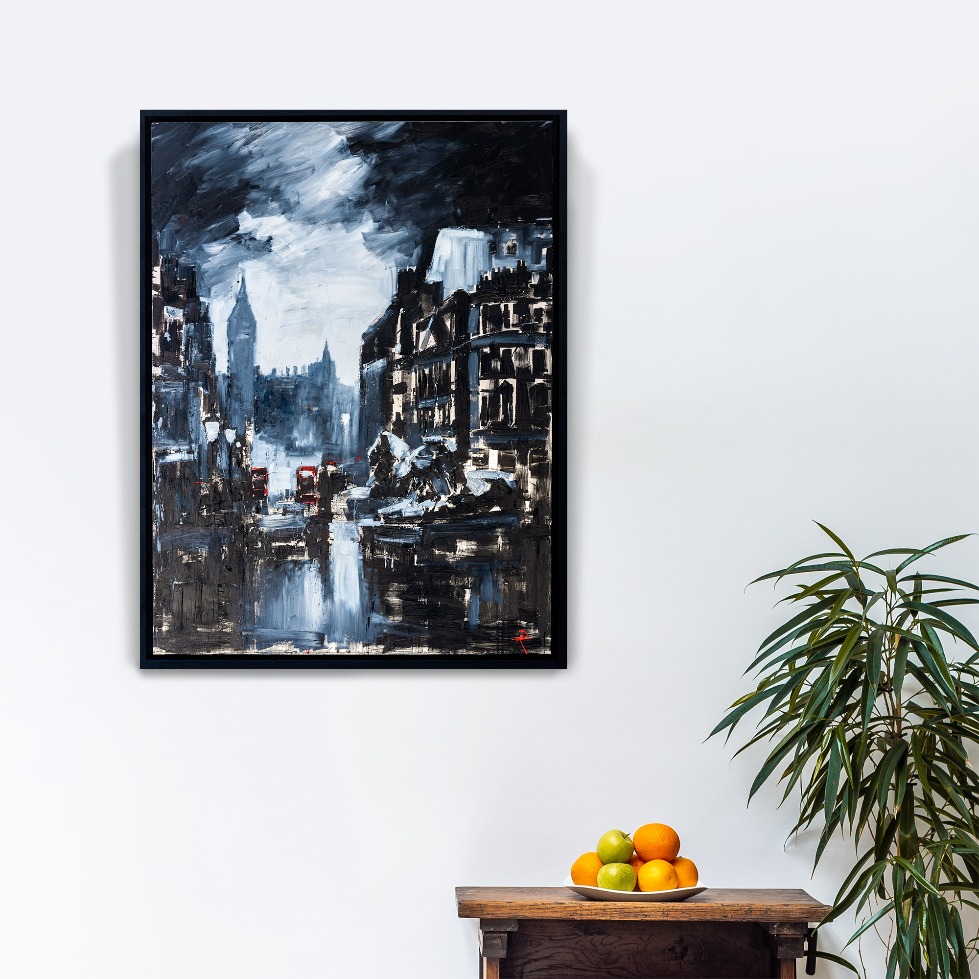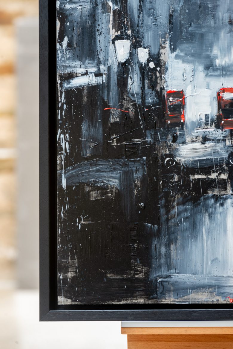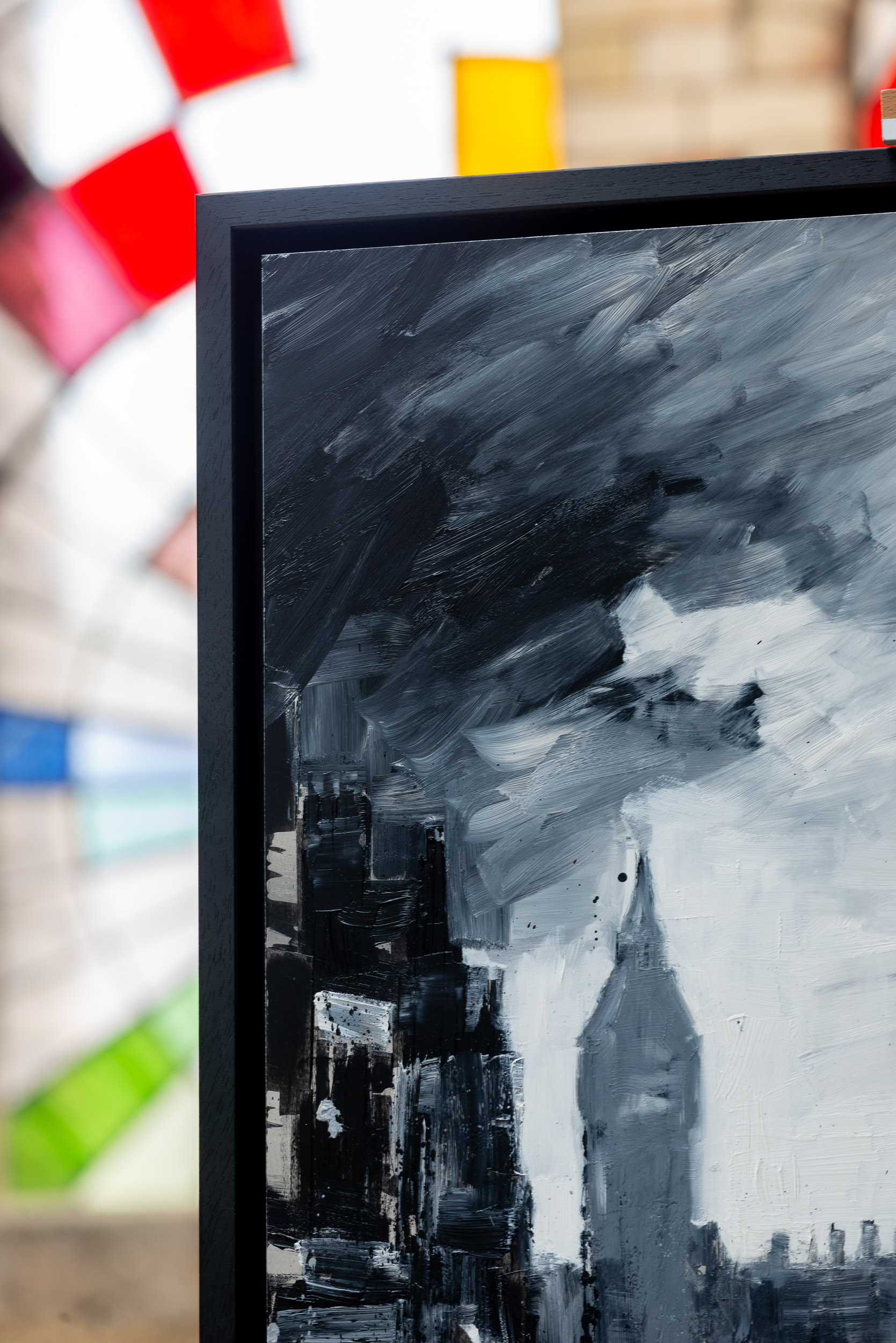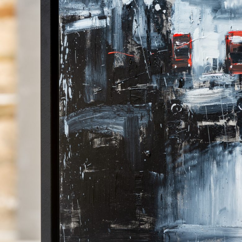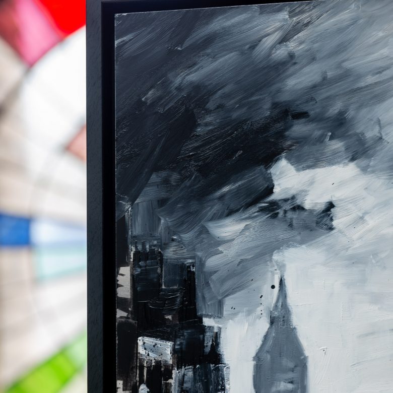 “Immerse into London” is part of Paul’s “Impressionistic Distance” series. Paul has painted with vigorous brushwork and loosly defined forms to create movement, much like impressionist painters before him. Using a monochrome palette, Paul puts emphasis on accurately capturing the light in its ever-changing qualities.
