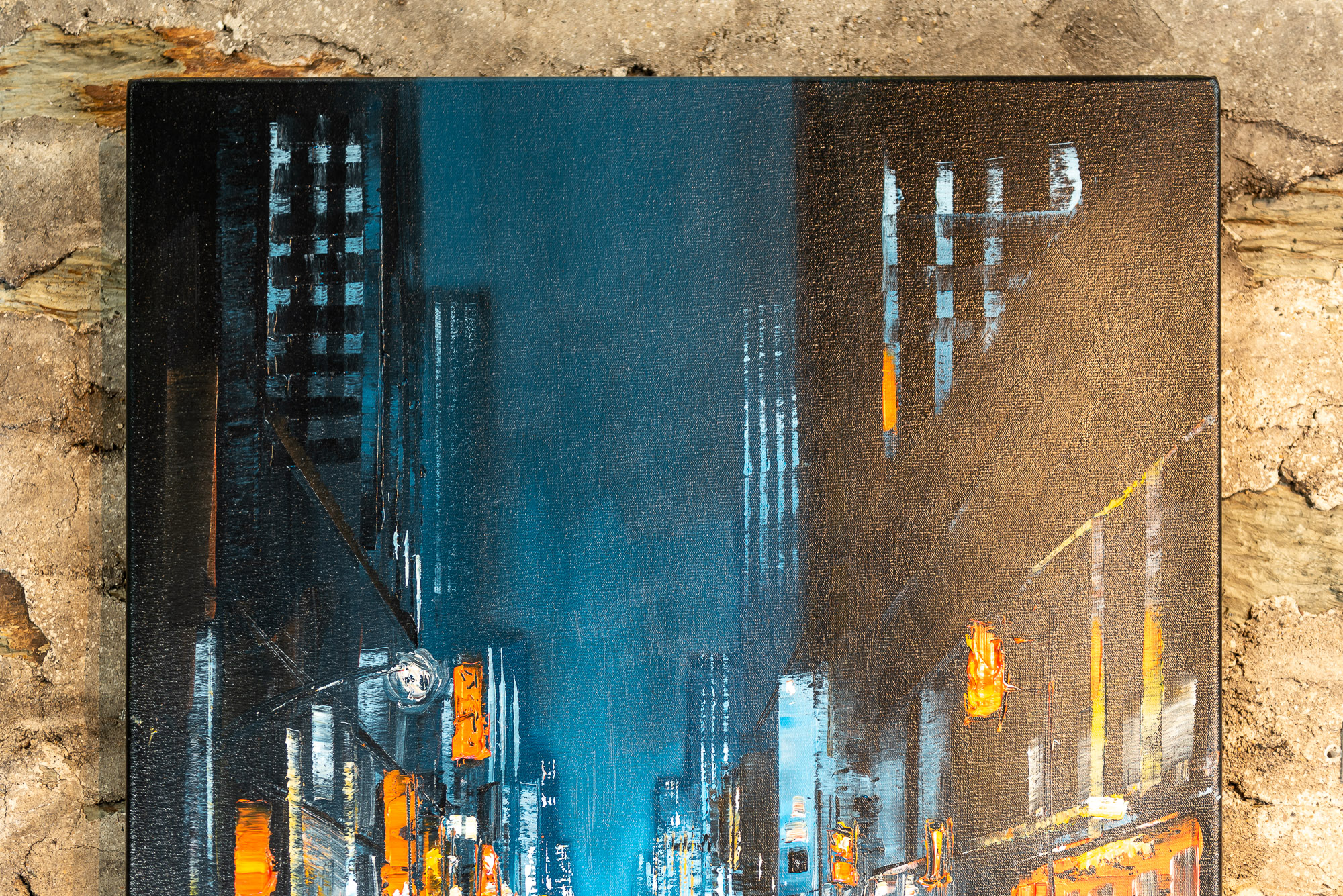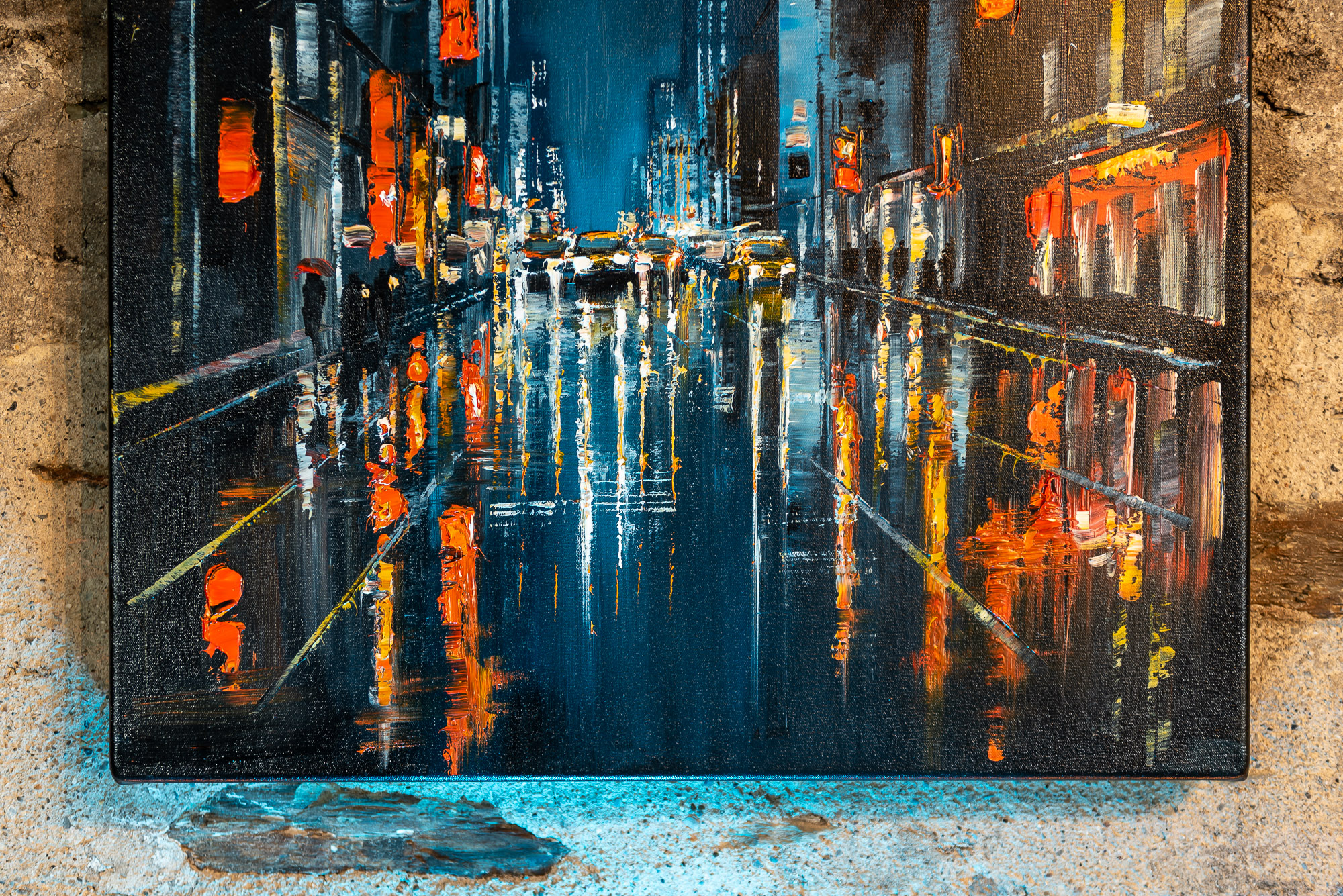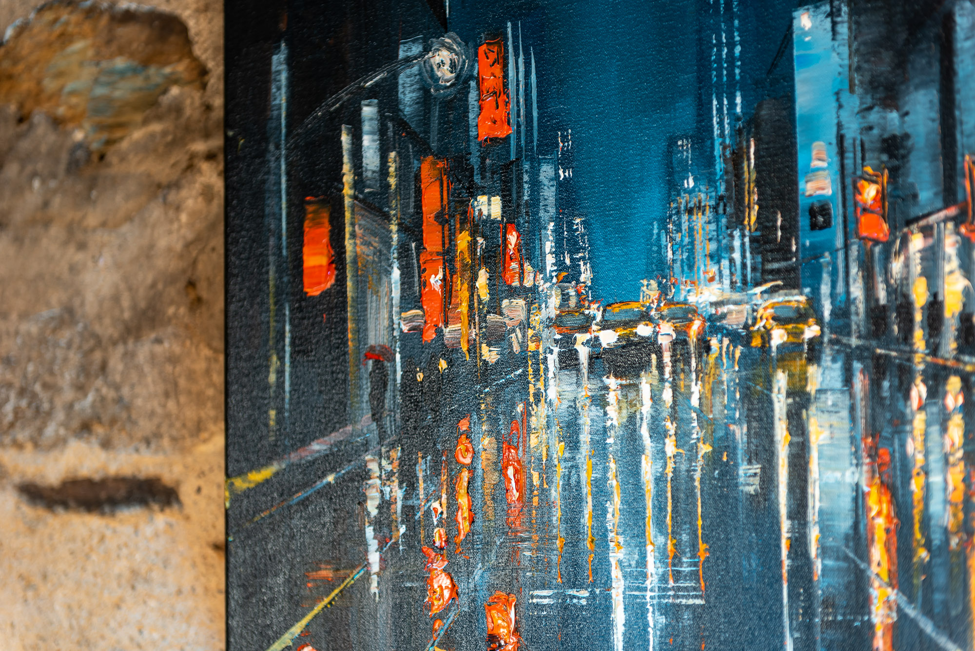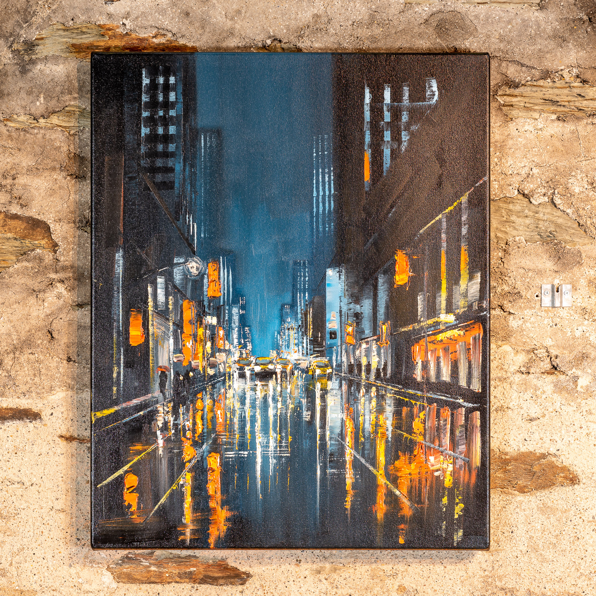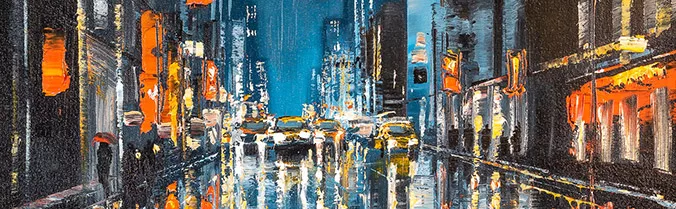 The light of the city illuminates the sky softly, as taxis make their way through the animated streets of New York below. Textural dabs of orange light flicker on the glistening surfaces of the city after rainfall, and glow against the blue of the night sky.