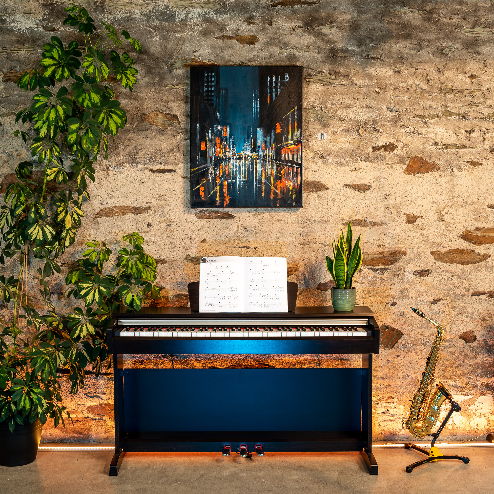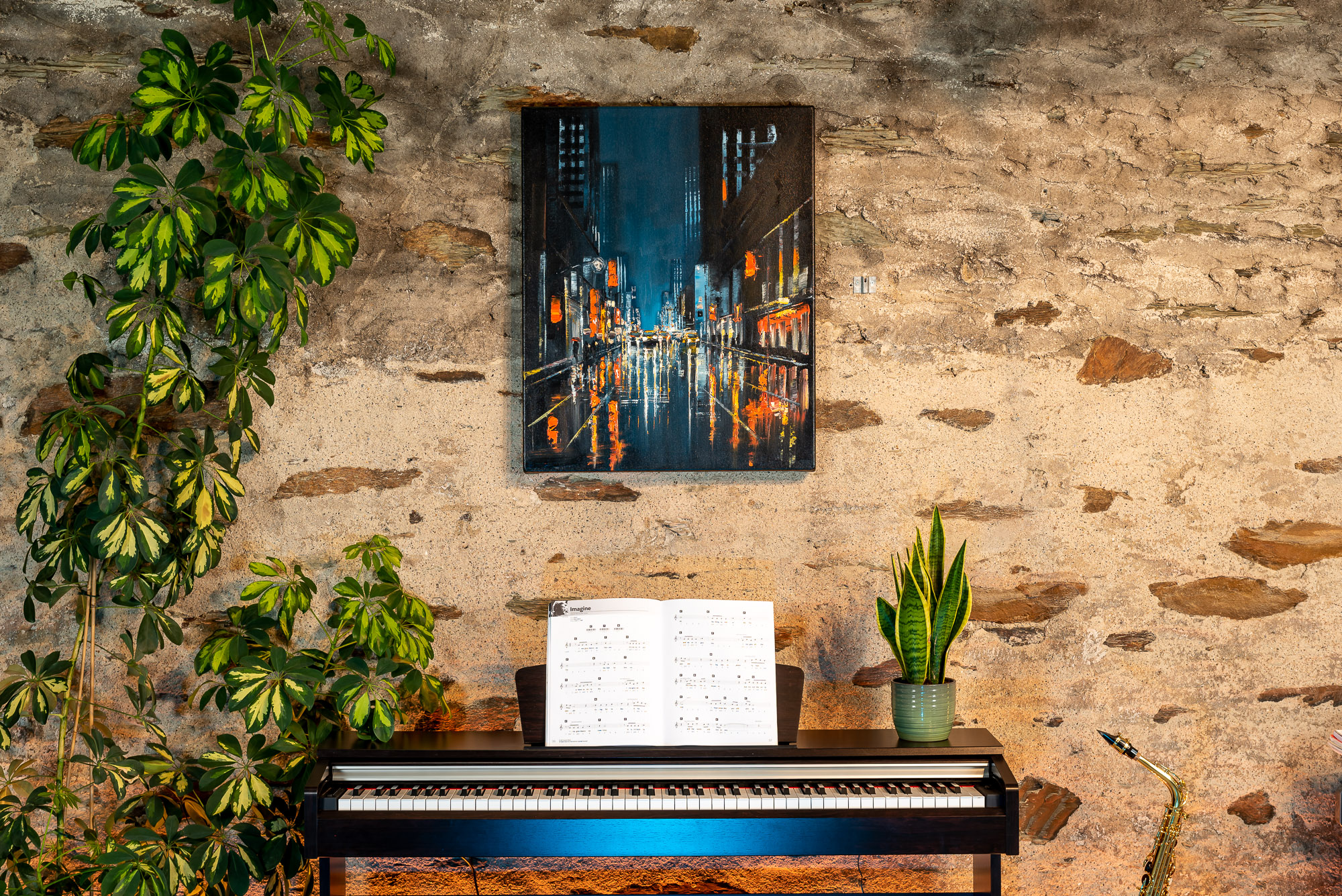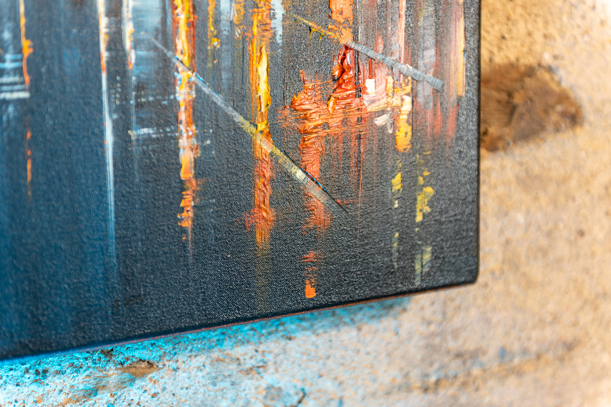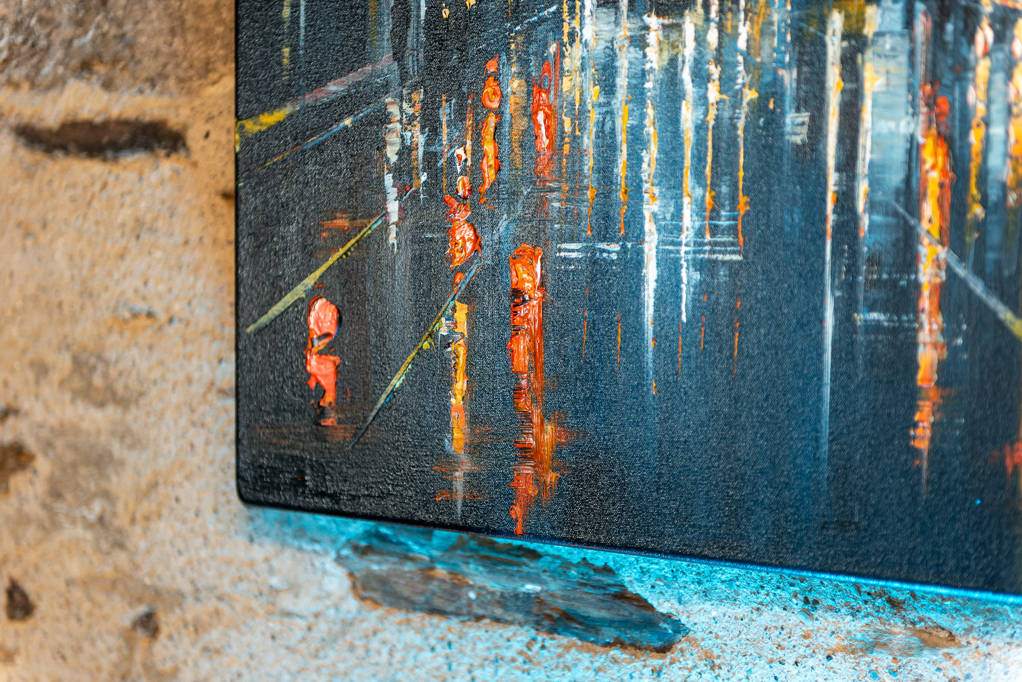 The light of the city illuminates the sky softly, as taxis make their way through the animated streets of New York below. Textural dabs of orange light flicker on the glistening surfaces of the city after rainfall, and glow against the blue of the night sky.