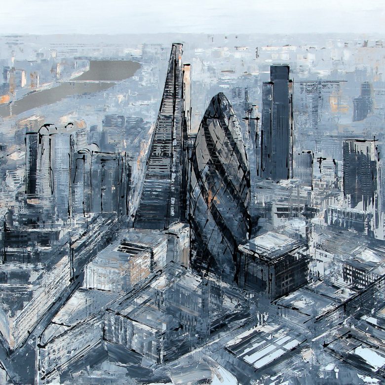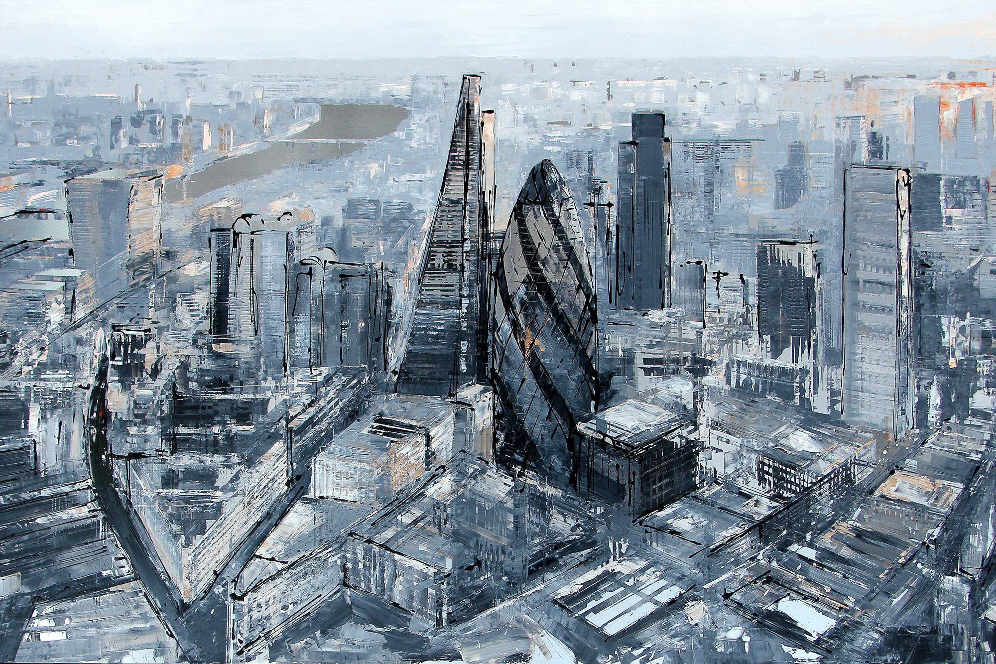 Hazy monochrome tones and energetic dripped lines make up this spectacular aerial view of the City of London and beyond.