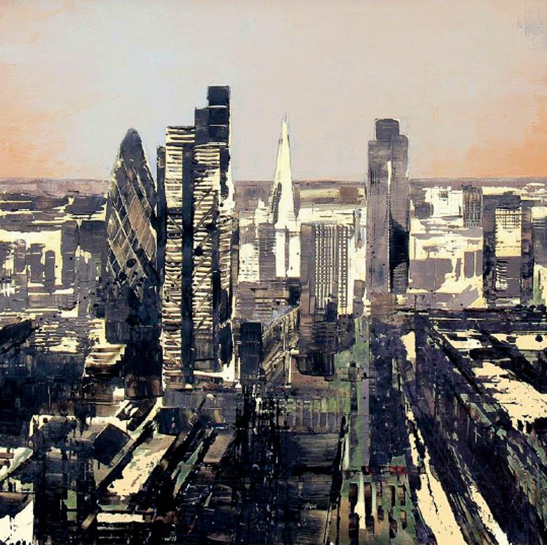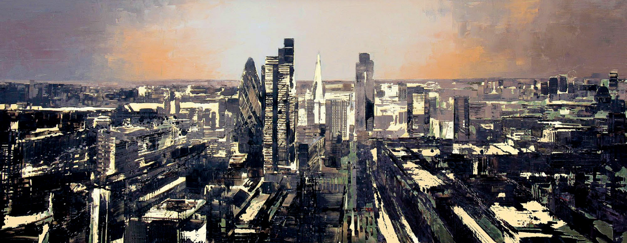 Exposed brass allows for mesmerising reflections of warm sunset light within the London skyline. Directional lines in thick black oil paint guide the eye towards the depths of the city, where iconic strictures such as the Gherkin and the Shard are seen rising high into the sky.