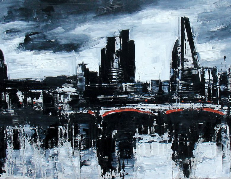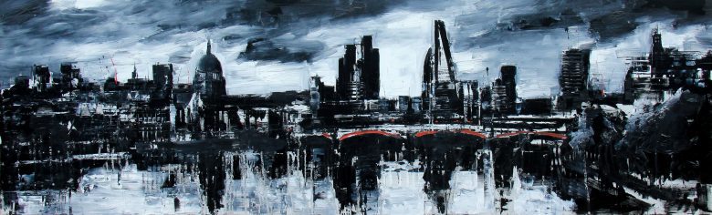 The iconic London cityscape is painted with deep black oil paint and quick, impasto brushstrokes. A monochrome palette emphasises the dramatic atmosphere of the heavy clouds overhead.