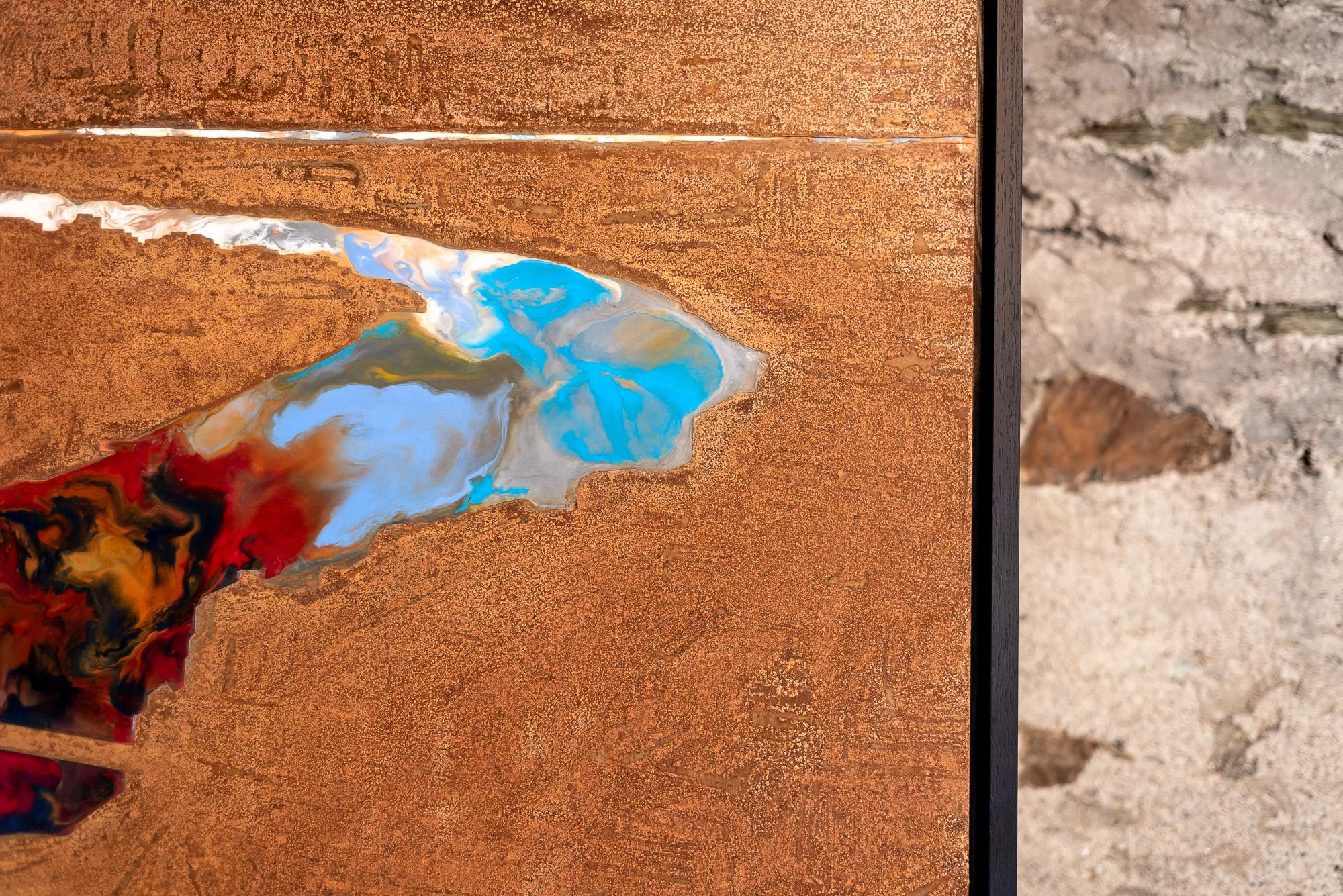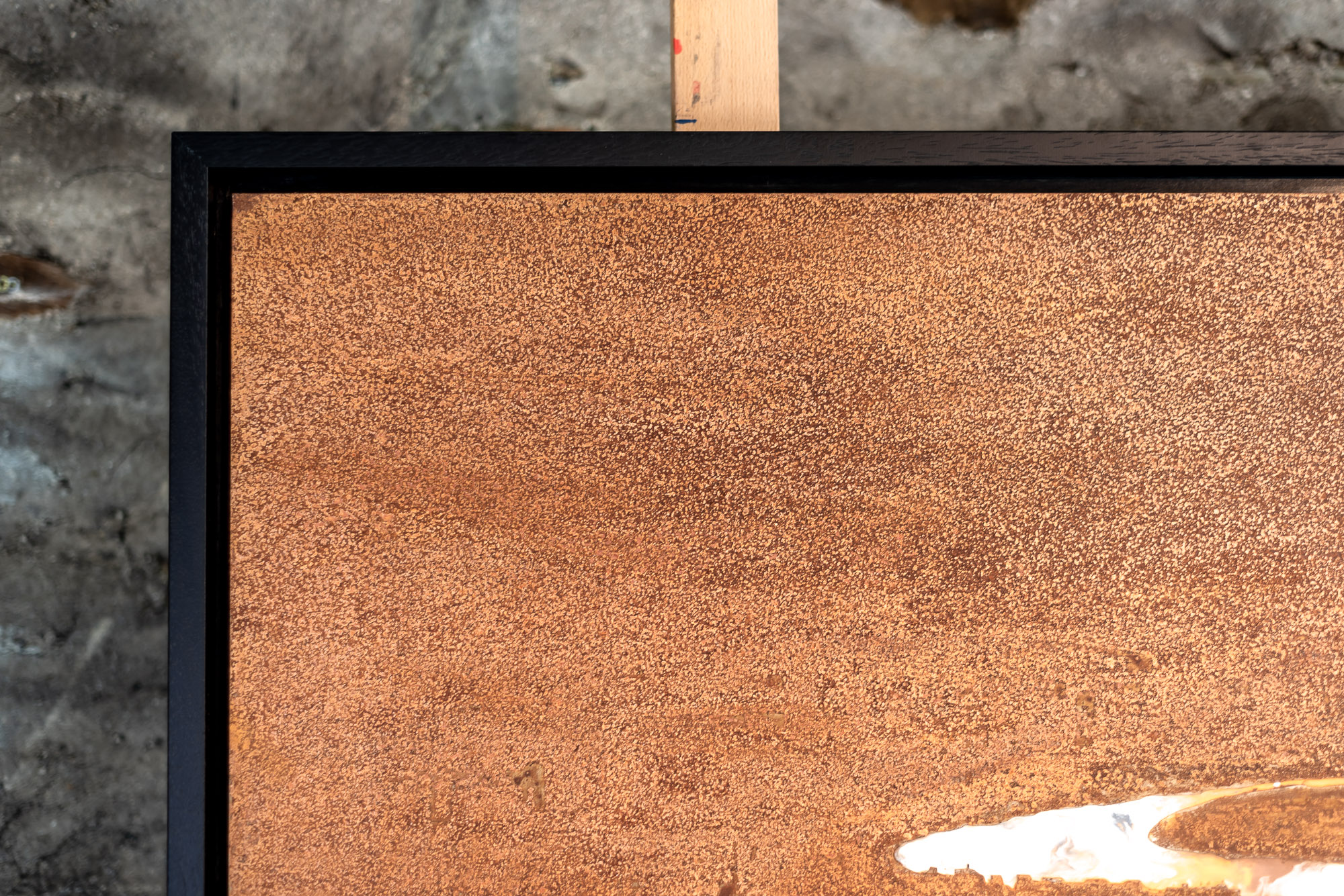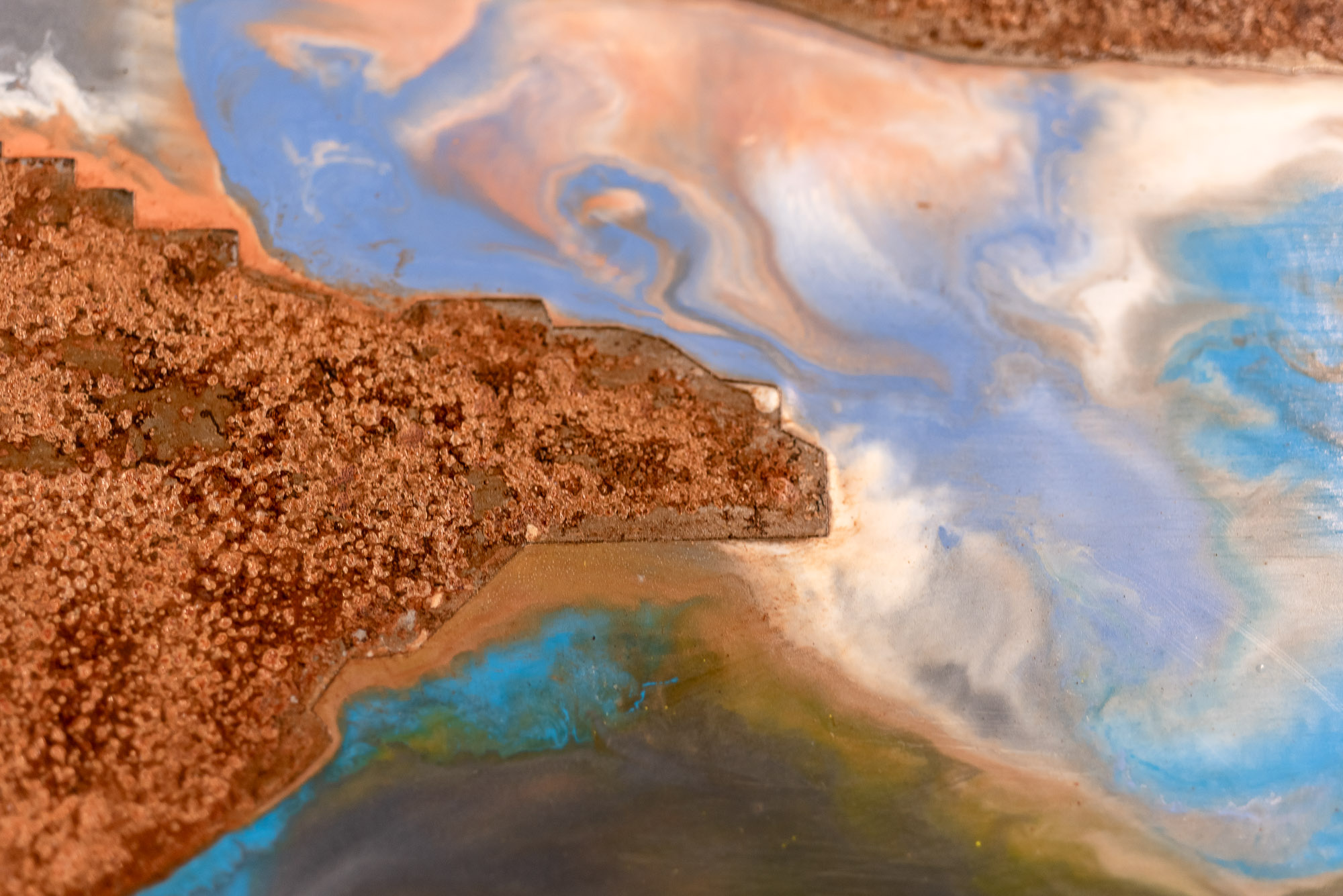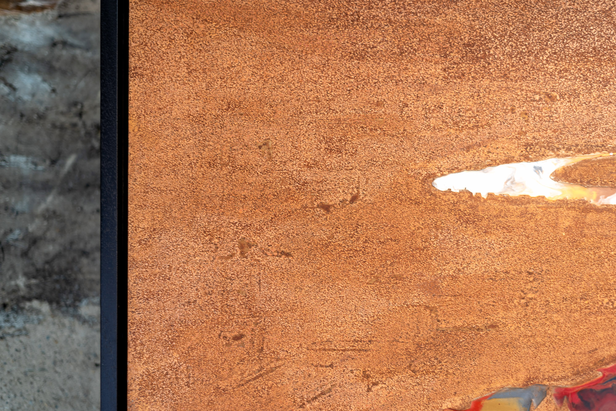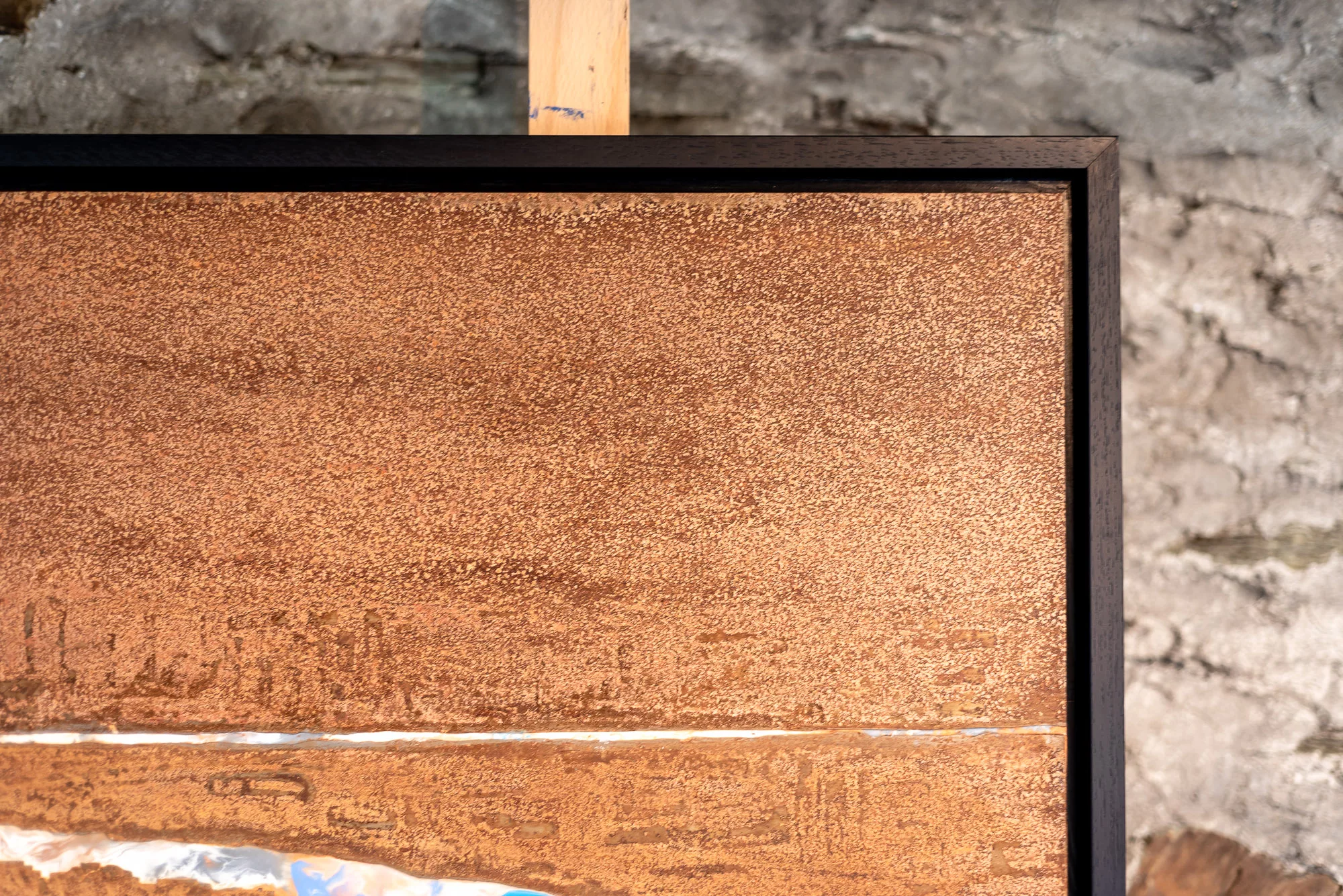 The organic nature of rust, in combination with Paul’s own distressed strokes in the metallic surface give this piece a truly unique character that can be appreciated from multiple distances and perspectives. The macro-like detail that you can observe in the warm oxidisation patterns, alongside Paul’s detailed interweaving of colour is endlessly alluring. Leaving out fine details, Paul has focussed solely on the strong curve of the River Thames, with the distinct silhouette of Tower Bridge firmly situating the piece in London.