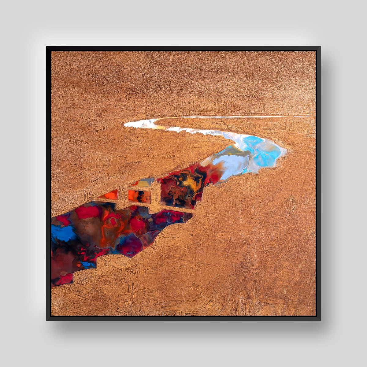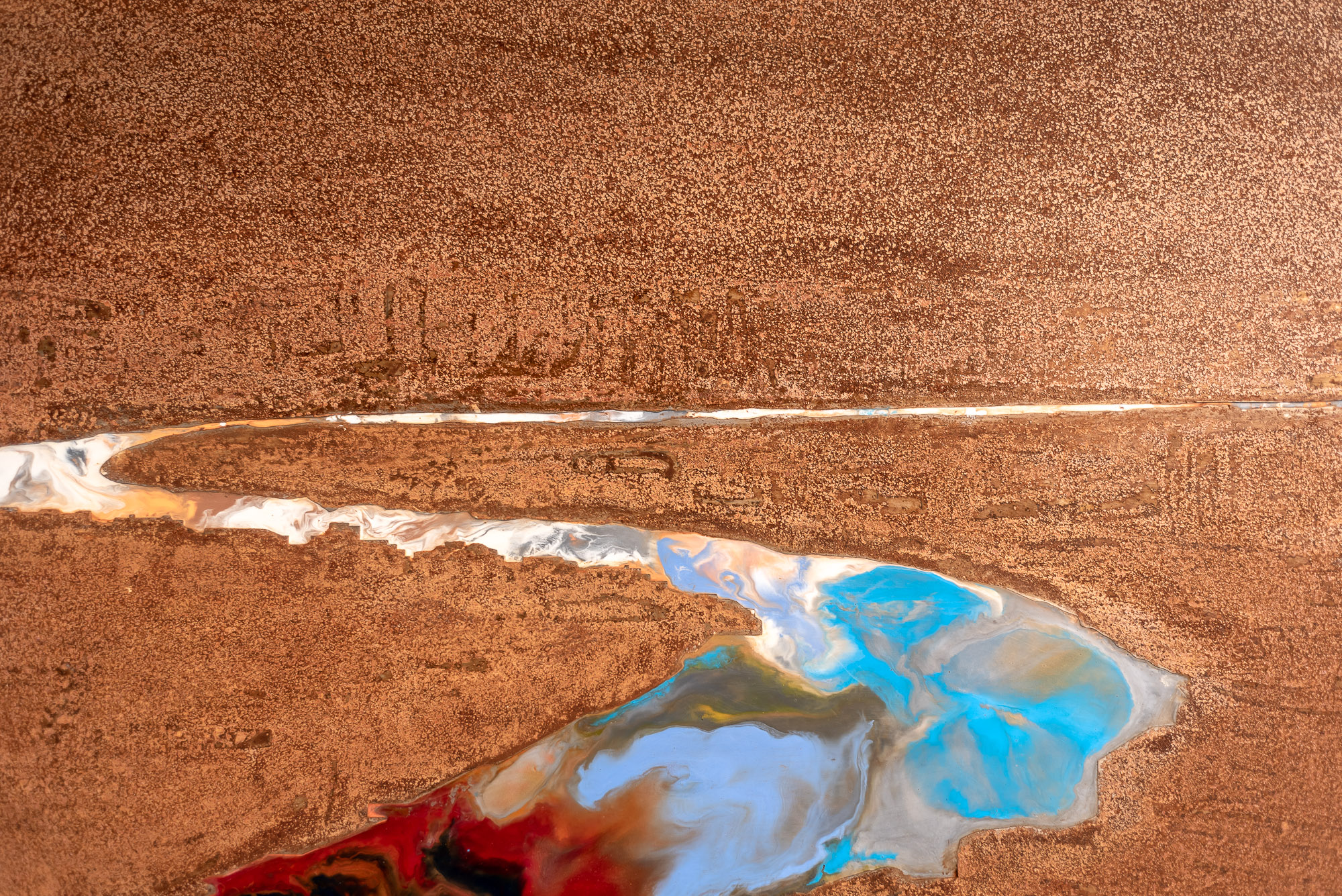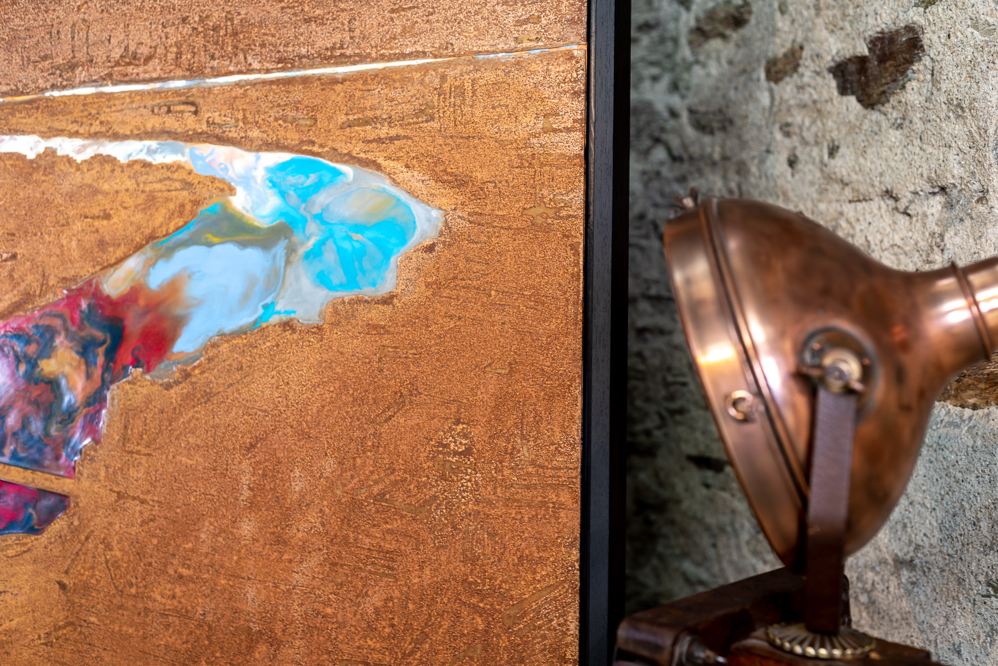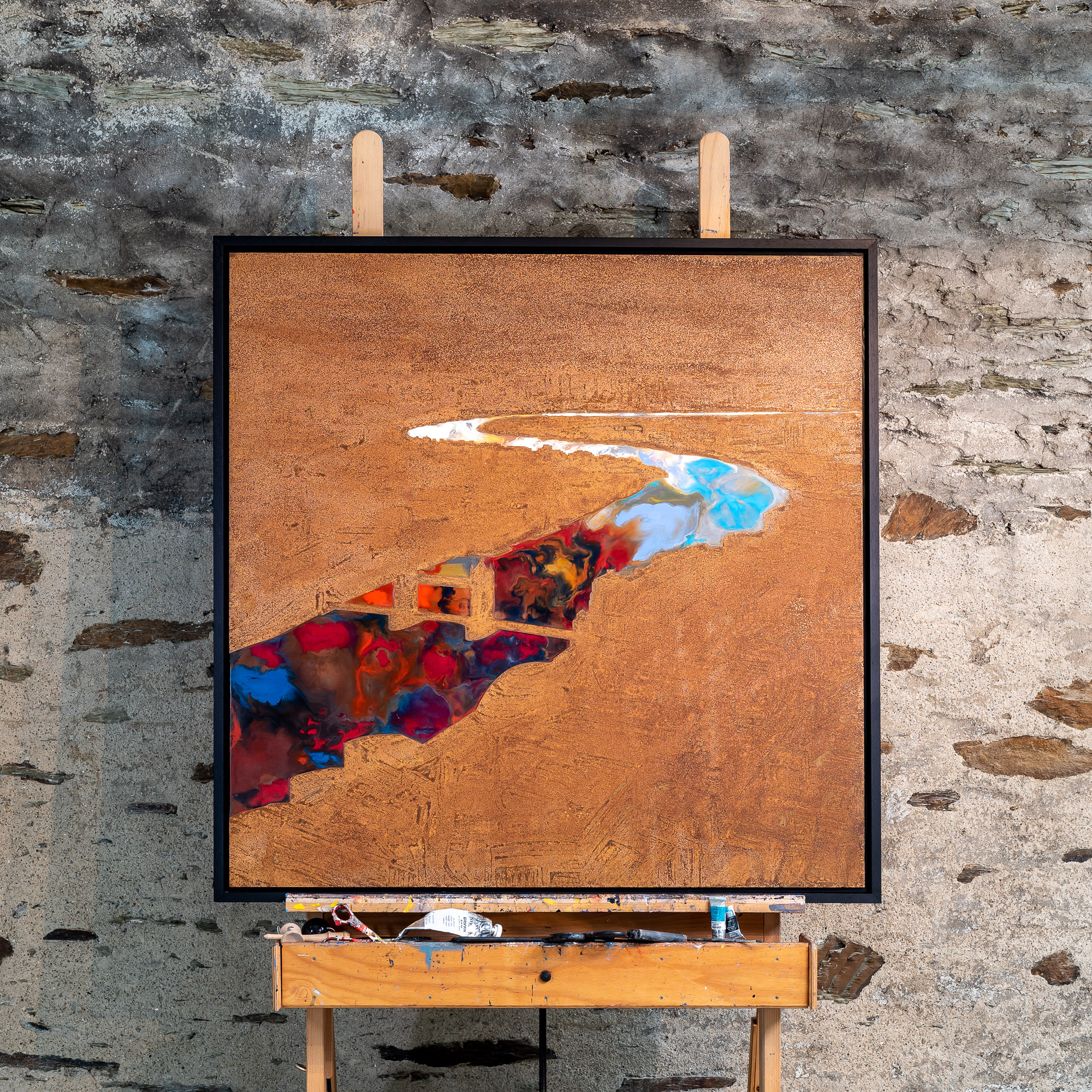 The organic nature of rust, in combination with Paul’s own distressed strokes in the metallic surface give this piece a truly unique character that can be appreciated from multiple distances and perspectives. The macro-like detail that you can observe in the warm oxidisation patterns, alongside Paul’s detailed interweaving of colour is endlessly alluring. Leaving out fine details, Paul has focussed solely on the strong curve of the River Thames, with the distinct silhouette of Tower Bridge firmly situating the piece in London.