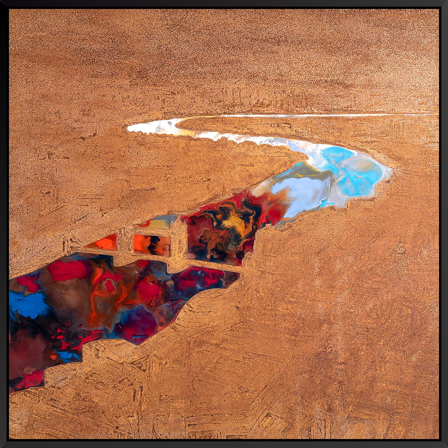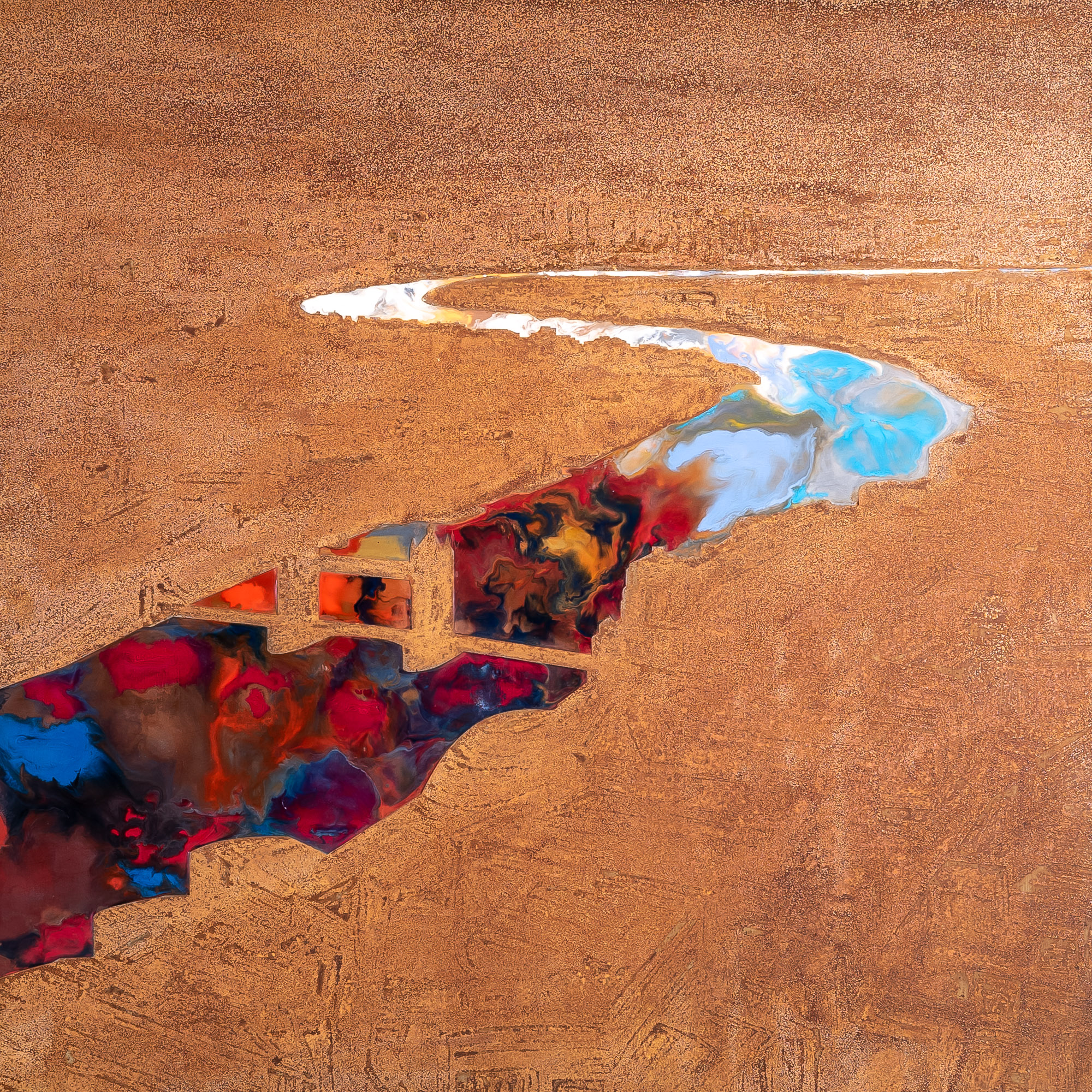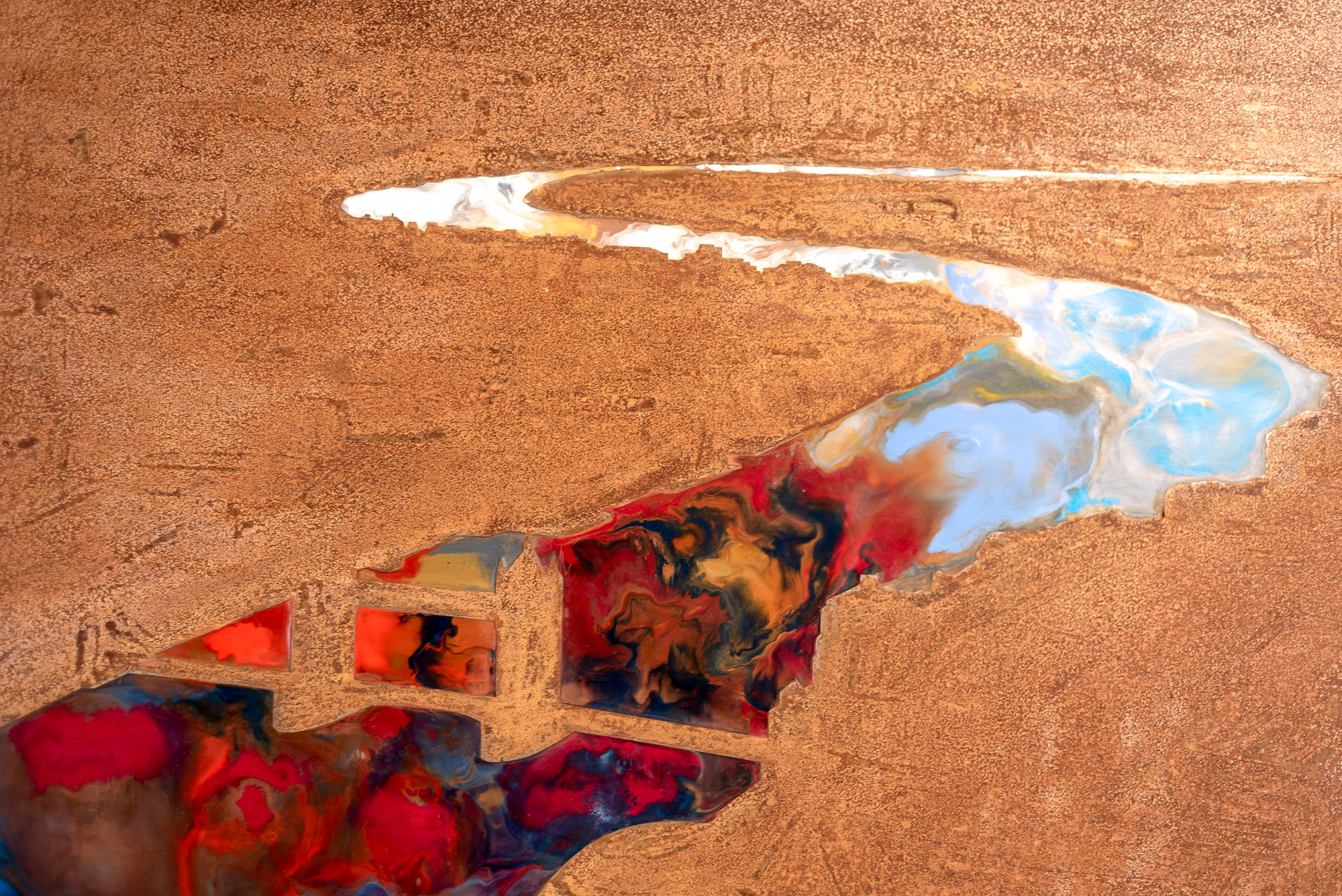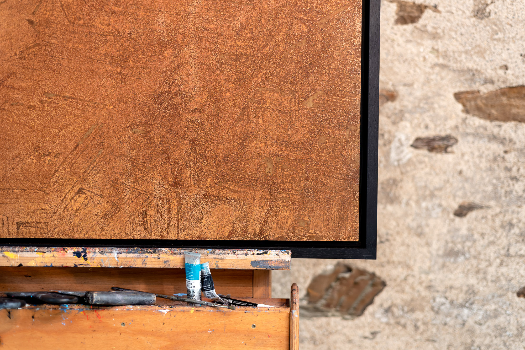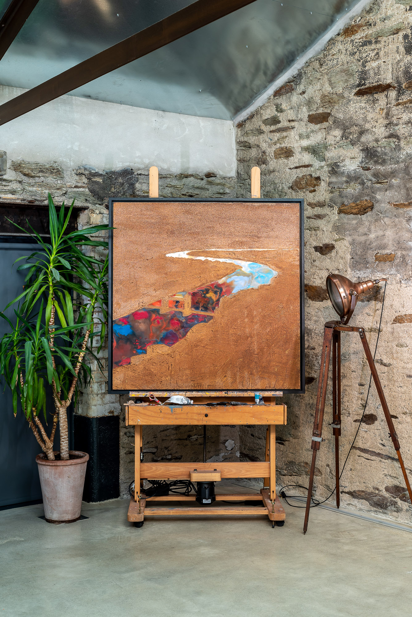 The organic nature of rust, in combination with Paul’s own distressed strokes in the metallic surface give this piece a truly unique character that can be appreciated from multiple distances and perspectives. The macro-like detail that you can observe in the warm oxidisation patterns, alongside Paul’s detailed interweaving of colour is endlessly alluring. Leaving out fine details, Paul has focussed solely on the strong curve of the River Thames, with the distinct silhouette of Tower Bridge firmly situating the piece in London.