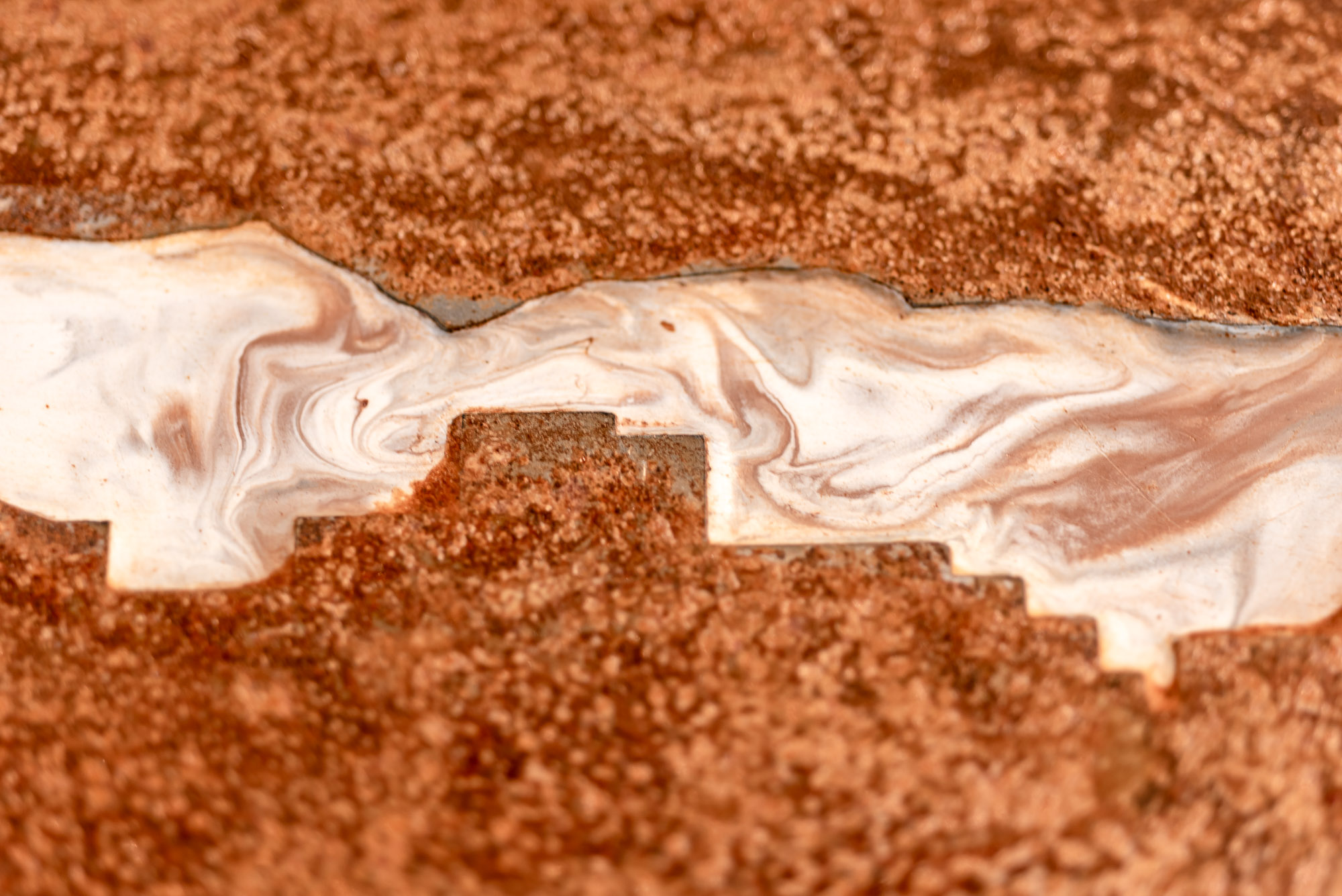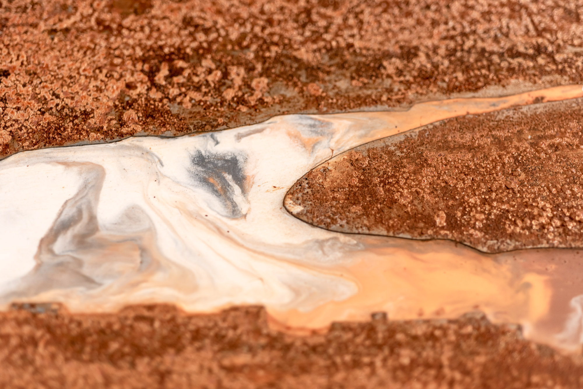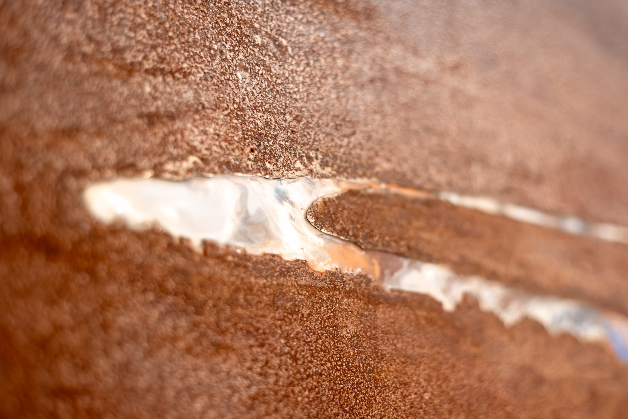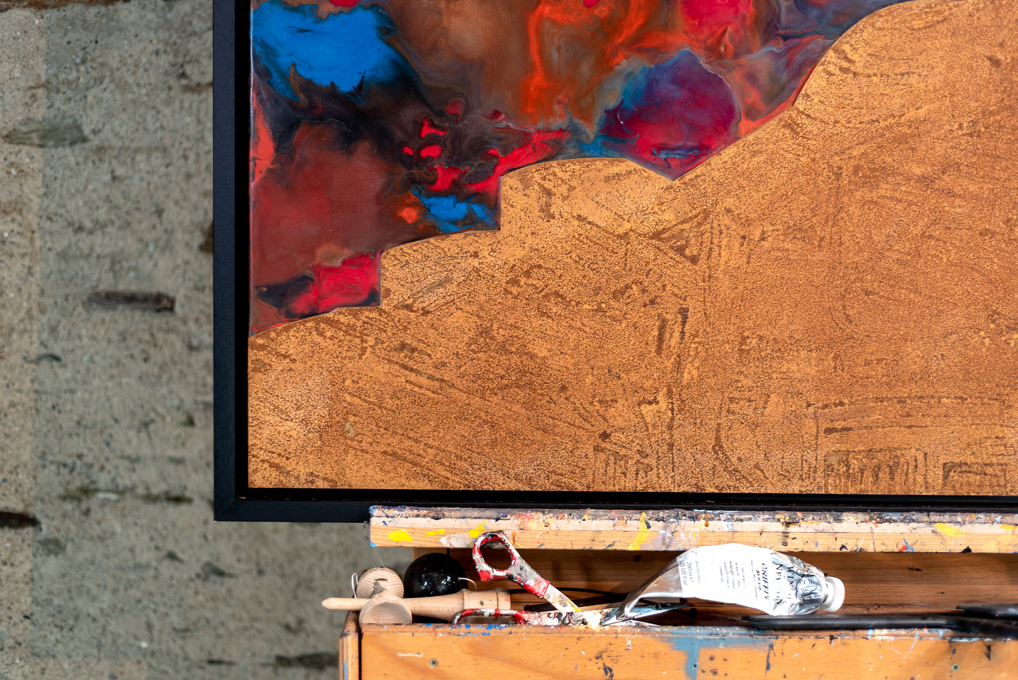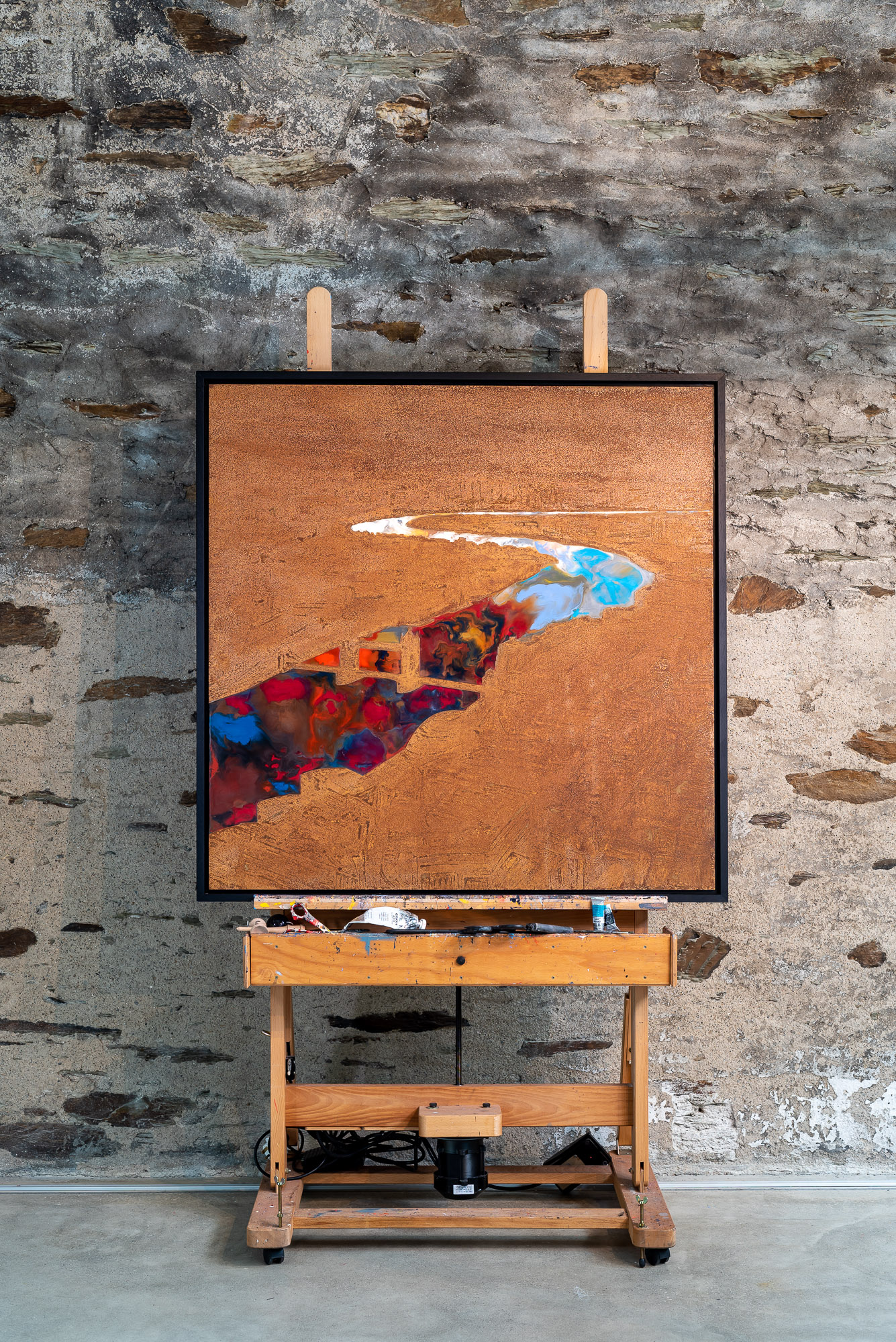 The organic nature of rust, in combination with Paul’s own distressed strokes in the metallic surface give this piece a truly unique character that can be appreciated from multiple distances and perspectives. The macro-like detail that you can observe in the warm oxidisation patterns, alongside Paul’s detailed interweaving of colour is endlessly alluring. Leaving out fine details, Paul has focussed solely on the strong curve of the River Thames, with the distinct silhouette of Tower Bridge firmly situating the piece in London.