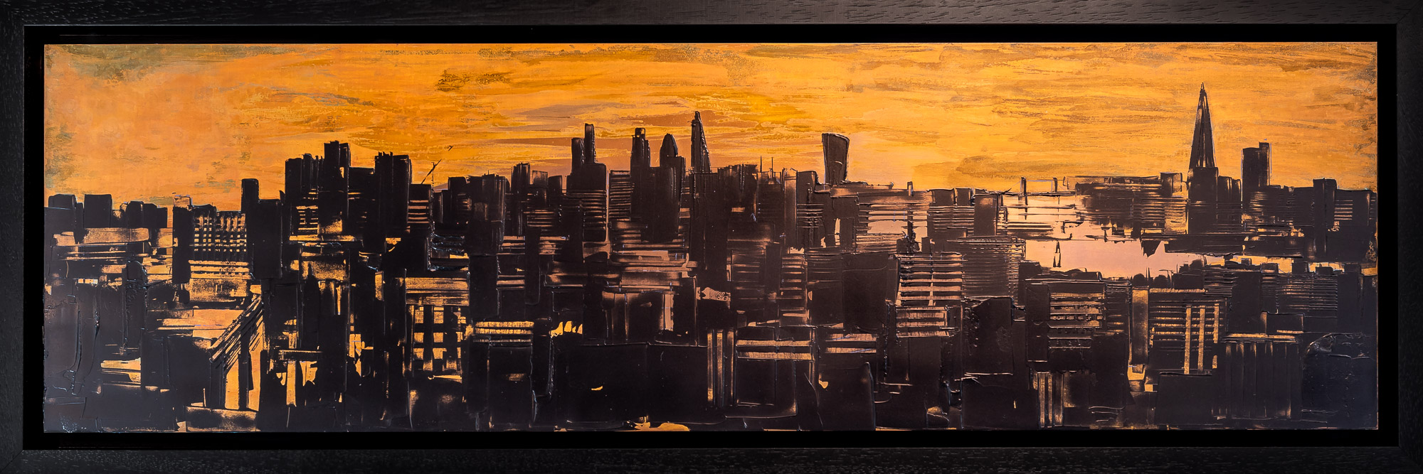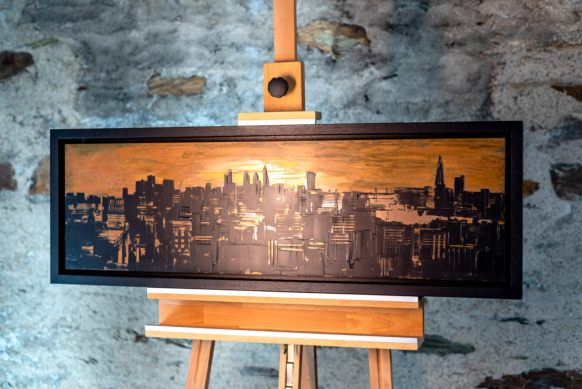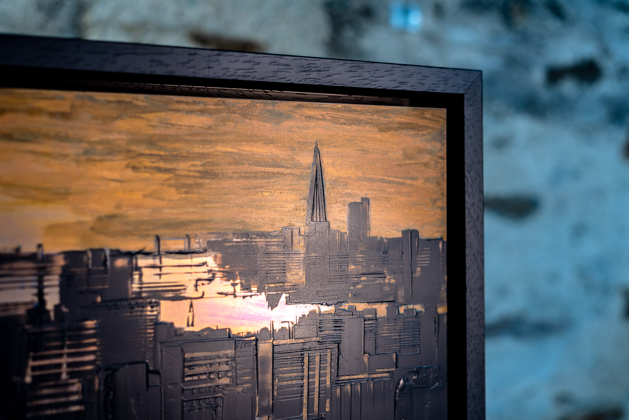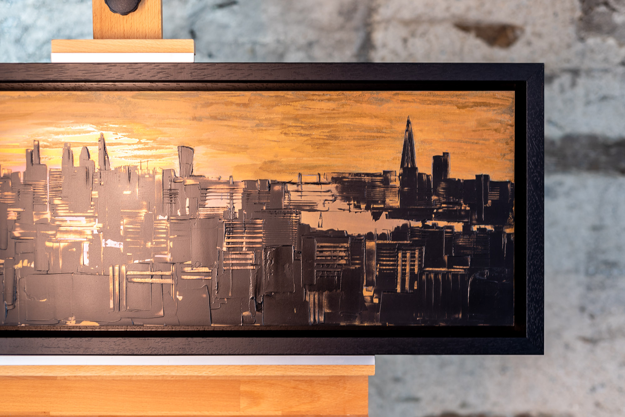 The stark contrast of the bold, textured matte strokes comprising the London skyline against the reflective, changing patina of the metal allow you to truly experience the late stages of Golden Hour.