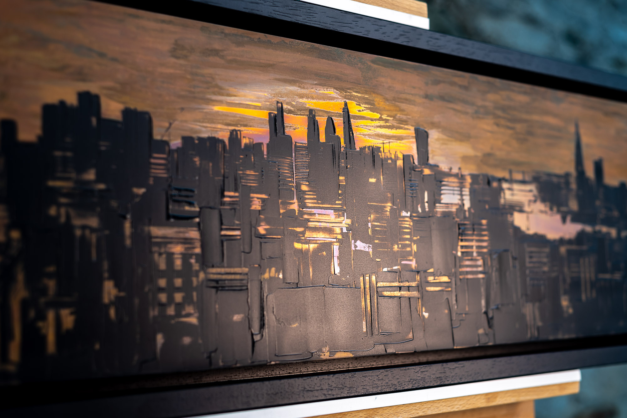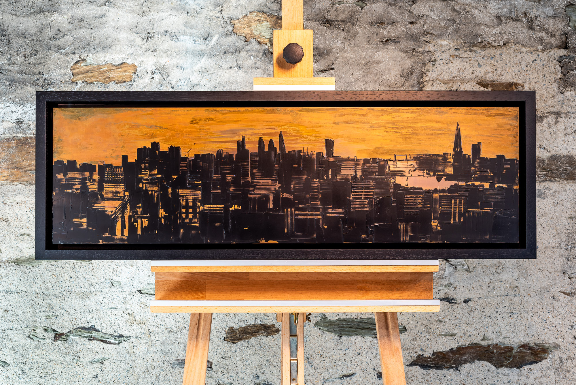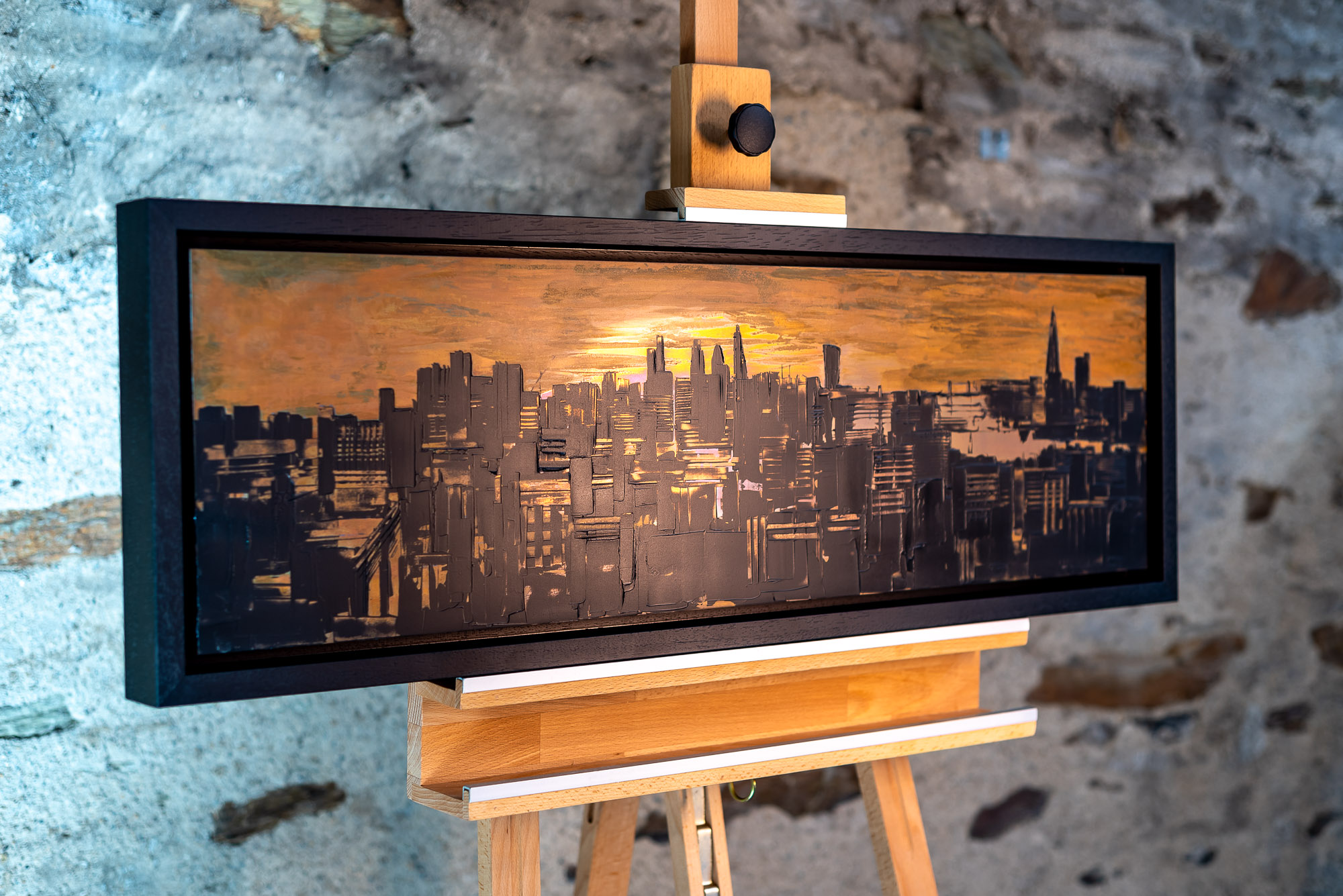 The stark contrast of the bold, textured matte strokes comprising the London skyline against the reflective, changing patina of the metal allow you to truly experience the late stages of Golden Hour.