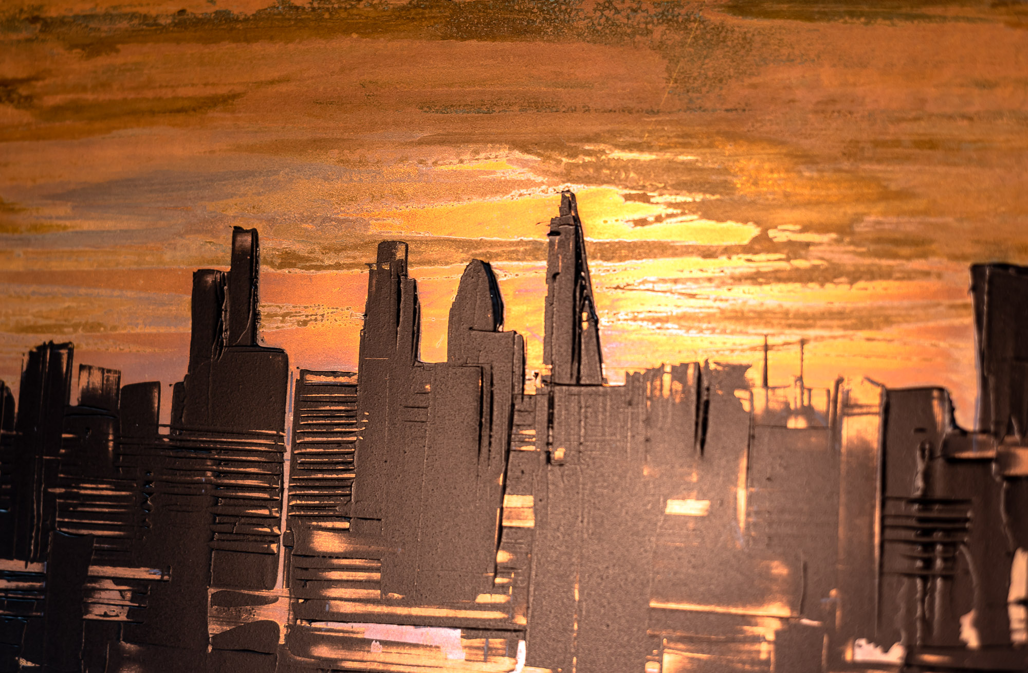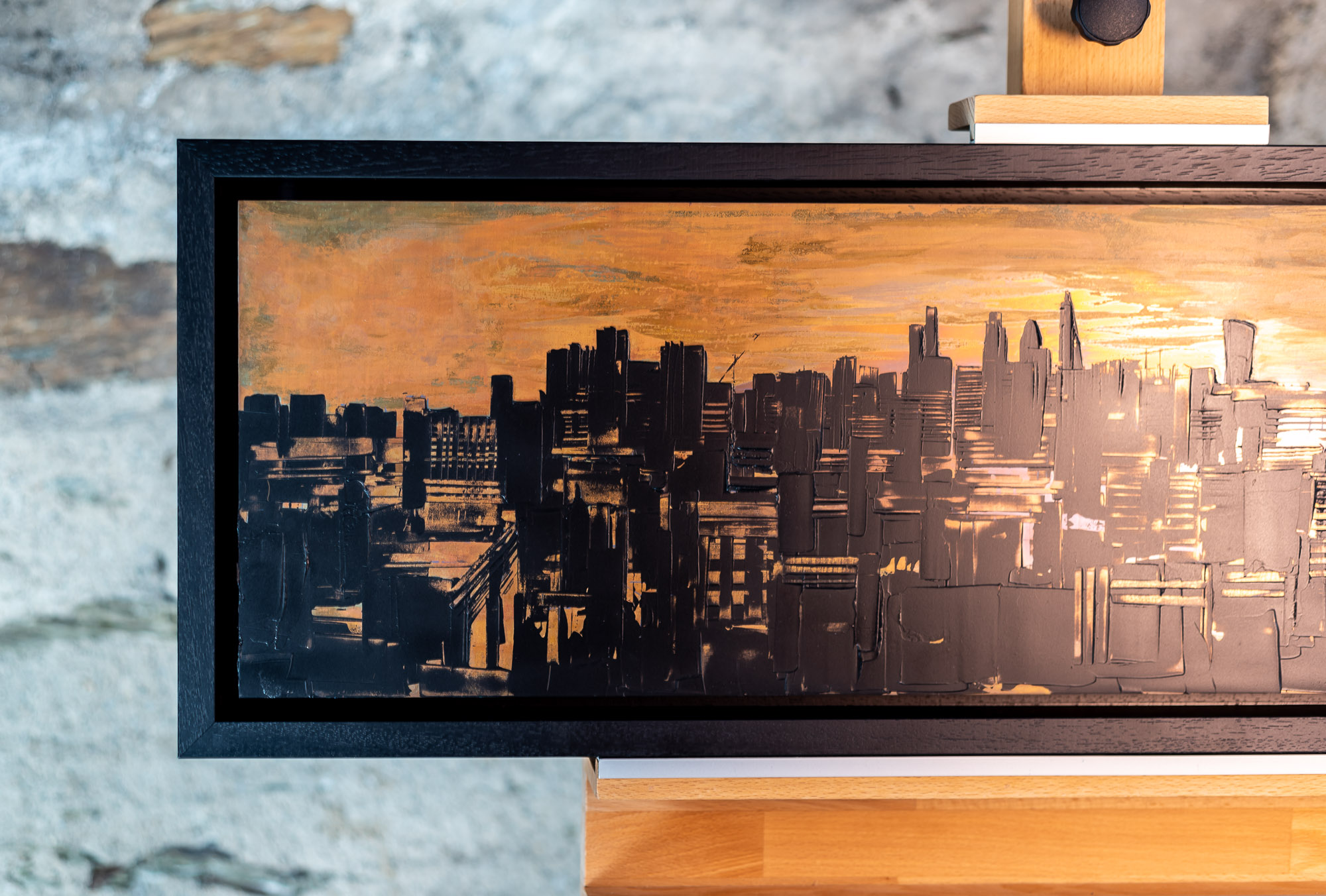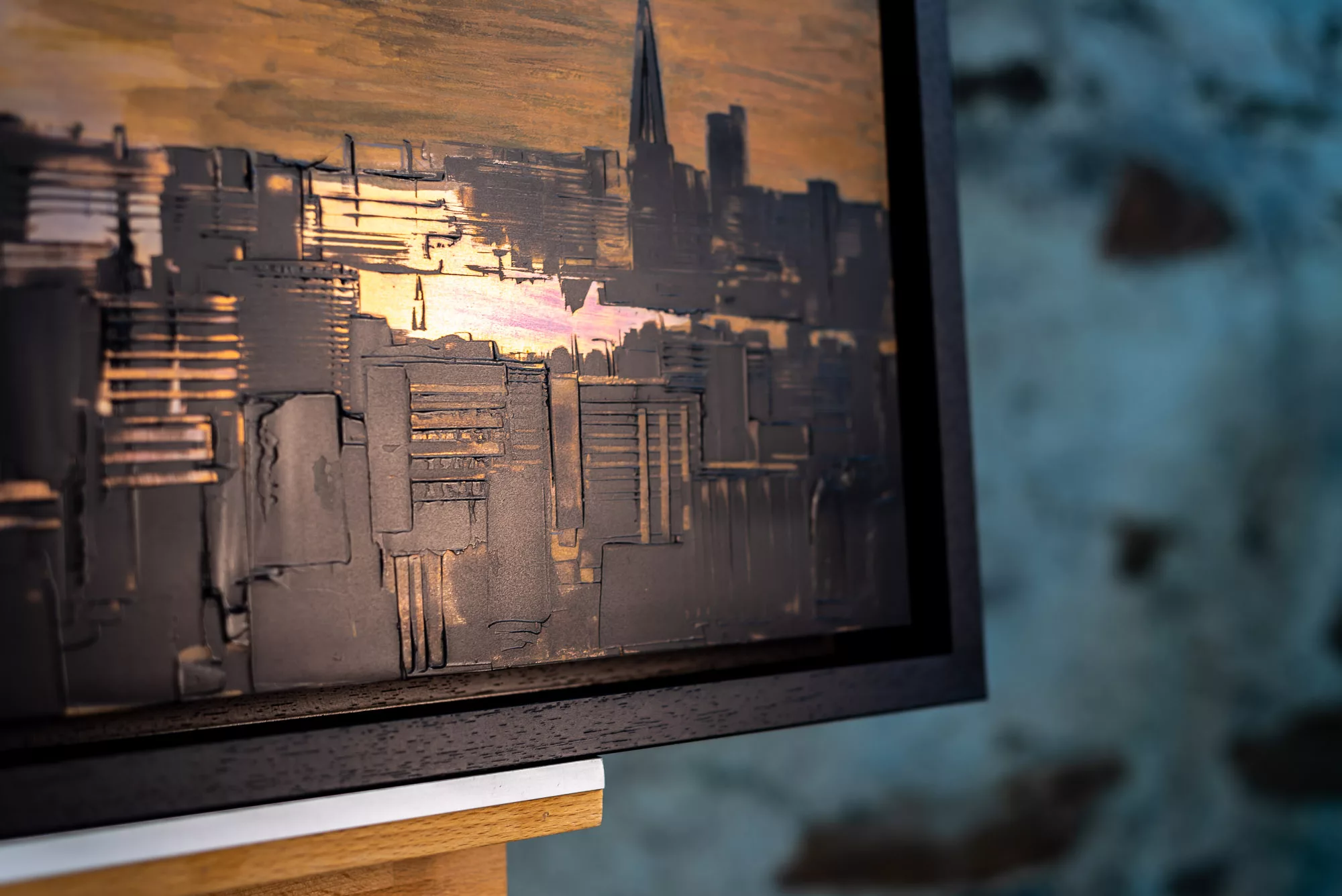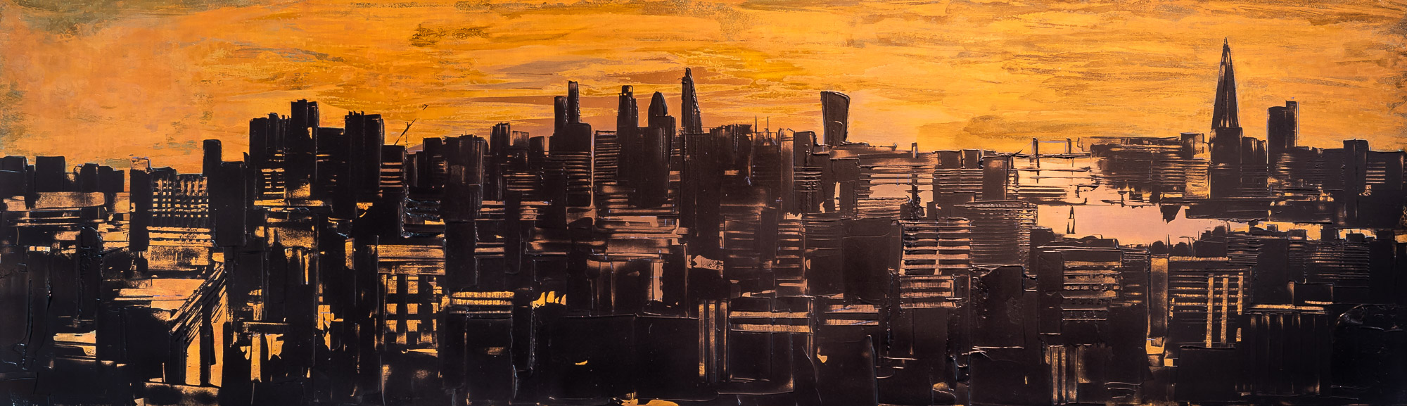 The stark contrast of the bold, textured matte strokes comprising the London skyline against the reflective, changing patina of the metal allow you to truly experience the late stages of Golden Hour.