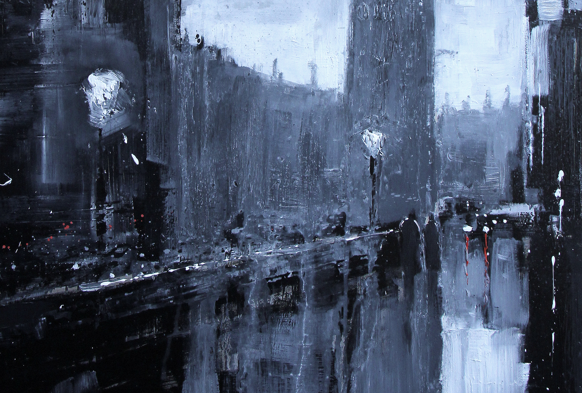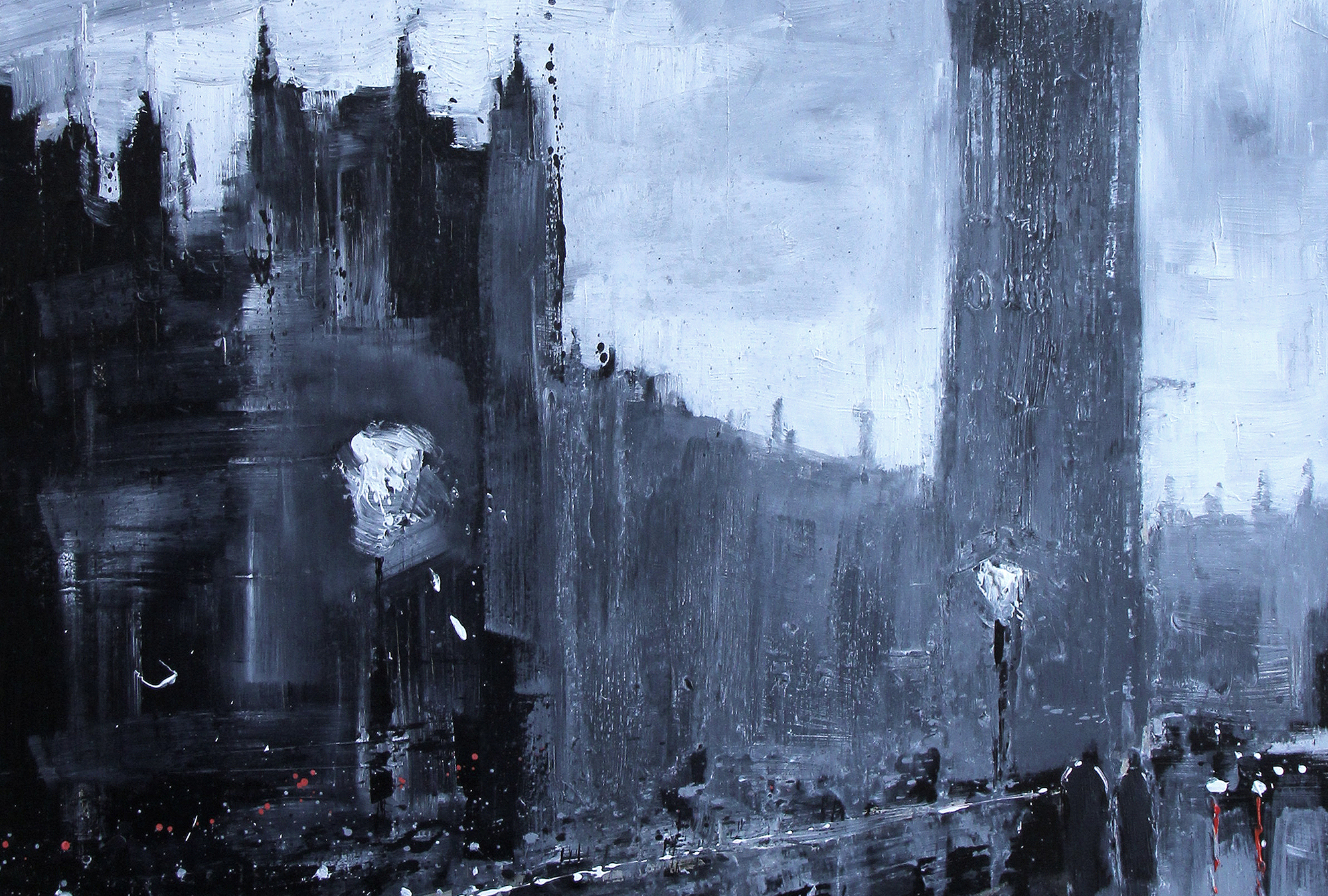 Breathe in the wintry air, as you pace over a misty Westminster Bridge. Lashings of fluid monochrome paint blend and intermix on the surface of the aluminium to form this atmospheric Westminster scene.